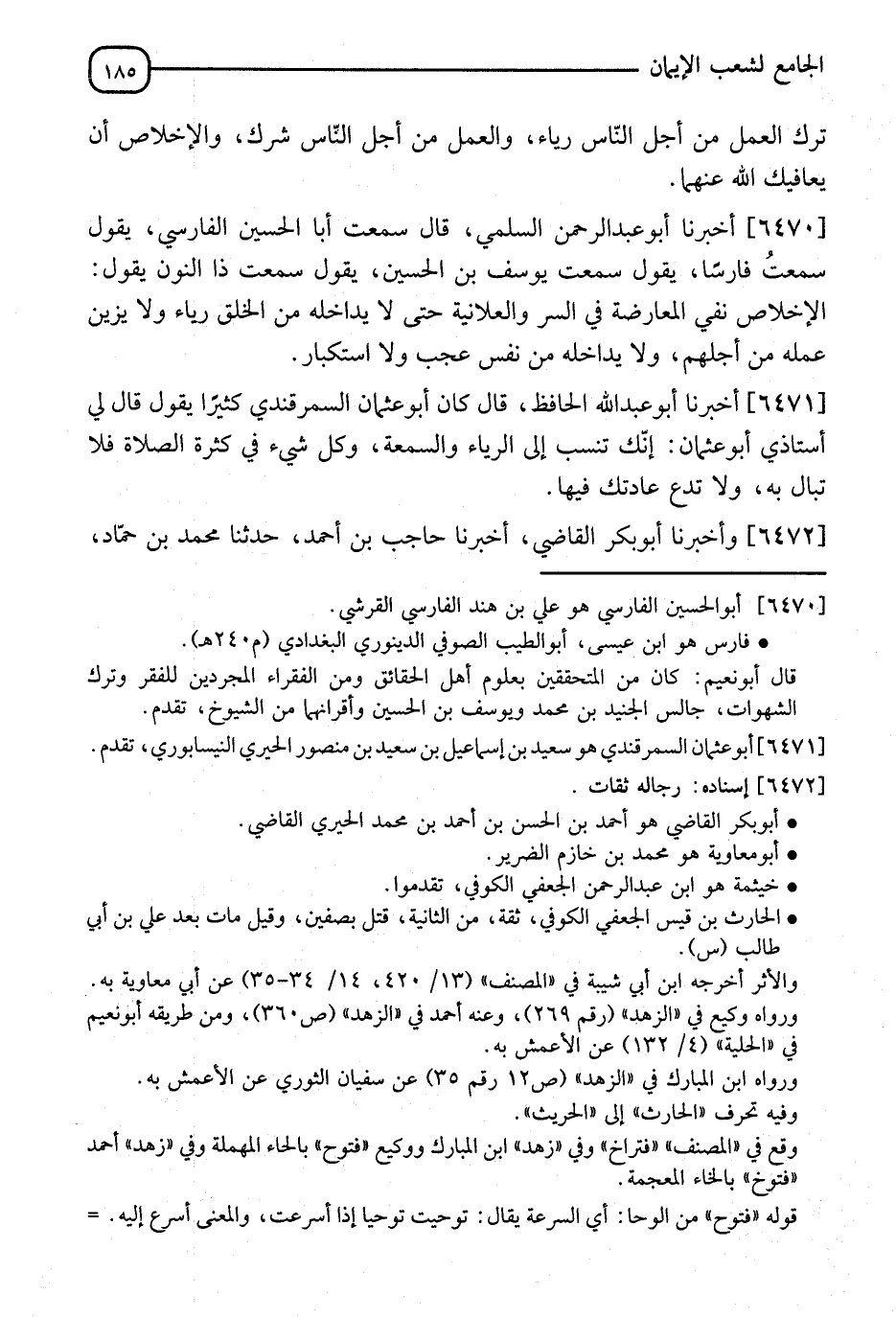 6470 - أَخْبَرَنَا أَبُو عَبْدِ الرَّحْمَنِ السَّلَمِيُّ، قَالَ: سَمِعْتُ أَبَا الْحُسَيْنِ الْفَارِسِيَّ، يَقُولُ: سَمِعْتُ فَارِسًا، يَقُولُ: سَمِعْتُ يُوسُفَ بْنَ الْحُسَيْنِ، يَقُولُ: سَمِعْتُ ذَا النُّونِ، يَقُولُ: " §الْإِخْلَاصُ نَفْيُ الْمُعَارَضَةِ فِي السِّرِّ وَالْعَلَانِيَةِ، حَتَّى لَا يُدَاخِلَهُ فِي الْخَلْقِ رِيَاءٌ، وَلَا يُزَيِّنَ عَمَلَهُ مِنْ أَجْلِهِمْ، وَلَا يُدَاخِلَهُ مِنْ نَفْسٍ عُجْبٌ وَلَا اسْتِكْبَارٌ "