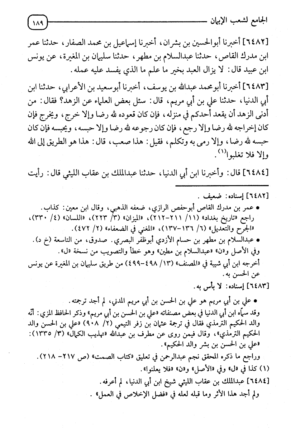 6483 - أَخْبَرَنَا أَبُو مُحَمَّدٍ عَبْدُ اللهِ بْنُ يُوسُفَ، أَنَا أَبُو سَعِيدِ بْنُ الْأَعْرَابِيِّ، نا ابْنُ أَبِي الدُّنْيَا، أَنَا عَلِيُّ بْنُ أَبِي مَرْيَمَ، قَالَ: سُئِلَ بَعْضُ الْعُلَمَاءِ عَنِ الزُّهْدِ، فَقَالَ: " §مِنْ أَدْنَى الزُّهْدِ أَنْ يَقْعُدَ أَحَدُكُمْ فِي مَنْزِلِهِ، فَإِنْ كَانَ قُعُودُهُ لِلَّهِ رِضًا وَإِلَّا خَرَجَ وَيَخْرُجُ، فَإِنْ كَانَ إِخْرَاجُهُ لِلَّهِ رِضًا وَإِلَّا رَجَعَ، فَإِنْ كَانَ رُجُوعُهُ لِلَّهِ رِضًا وَإِلَّا حَبَسَهُ وَيَحْبِسُهُ، فَإِنْ كَانَ حَبْسُهُ لِلَّهِ رِضًا وَإِلَّا تَكَلَّمَ فَقِيلَ هَذَا صَعْبٌ، فَقَالَ: هَذَا هُوَ الطَّرِيقُ إِلَى اللهِ وَإِلَّا فَلَا تُعْلِنُوا "