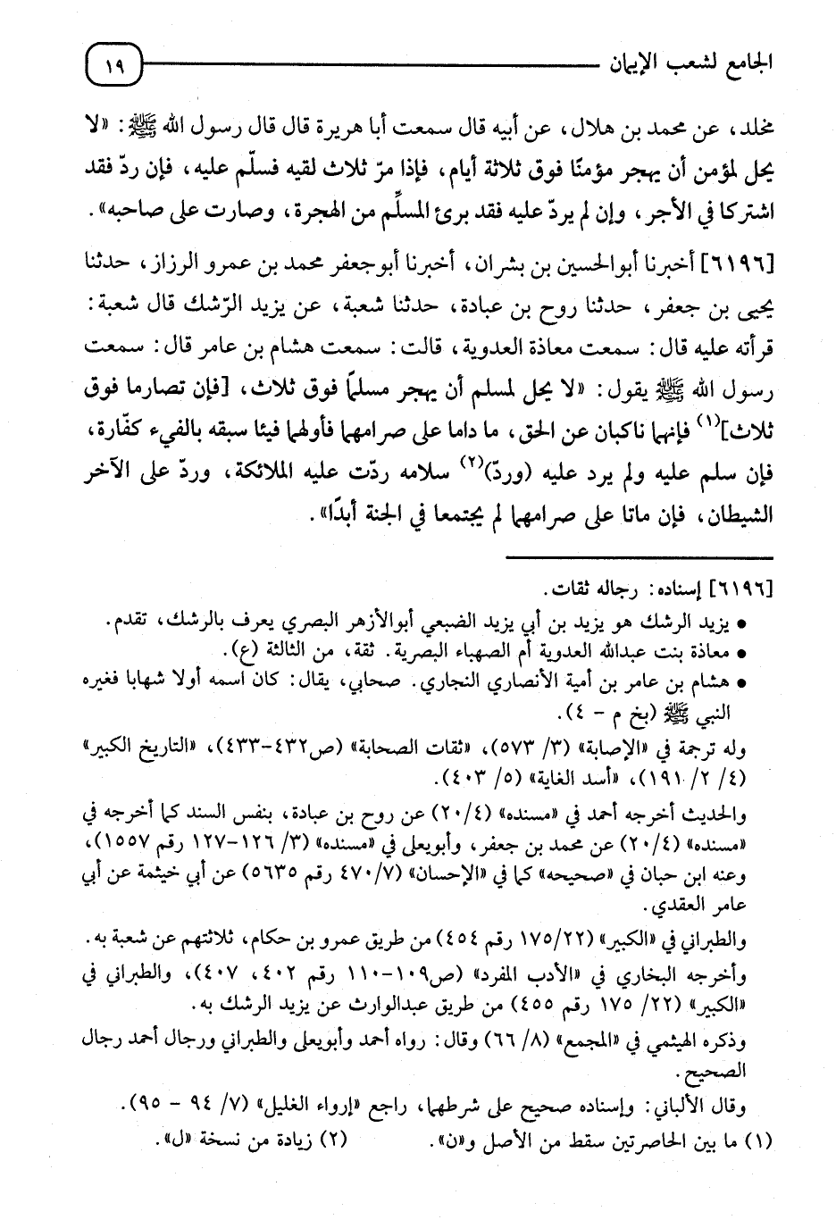 6196 - أَخْبَرَنَا أَبُو الْحُسَيْنِ بْنُ بِشْرَانَ، أَنَا أَبُو جَعْفَرٍ مُحَمَّدُ بْنُ عَمْرٍو الرَّزَّازُ، نا يَحْيَى بْنُ جَعْفَرٍ، نا رَوْحُ بْنُ عِبَادَةَ، نا شُعْبَةُ، عَنْ يَزِيدَ الرِّشْكِ، قَالَ شُعْبَةُ: قَرَأْتُهُ عَلَيْهِ، قَالَ: سَمِعْتُ مُعَاذَةَ الْعَدَوِيَّةَ، قَالَتْ: سَمِعْتُ هِشَامَ بْنَ عَامِرٍ، قَالَ: سَمِعْتُ النَّبِيَّ صَلَّى اللَّهُ عَلَيْهِ وَسَلَّمَ، يَقُولُ: " §لَا يَحِلُّ لِمُسْلِمٍ أَنْ يَهْجُرَ مُسْلِمًا فَوْقَ ثَلَاثٍ، فَإِنَّهُمَا نَاكِبَانِ عَنِ الْحَقِّ مَا دَامَا عَلَى صُرَامِهِمَا فَأَوَّلُهُمَا فَيْئًا سَبَقَهُ بِأَلْفَيْ كَفَّارَةٍ، فَإِنْ سَلَّمَ وَلَمْ يَرُدَّ عَلَيْهِ سَلَامَهُ رَدَّتْ عَلَيْهِ الْمَلَائِكَةُ وَرَدَّ عَلَى الْآخَرِ الشَّيْطَانُ فَإِنْ مَاتَا عَلَى صُرَامِهِمَا لَمْ يَجْتَمِعَا فِي الْجَنَّةِ أَبَدًا "