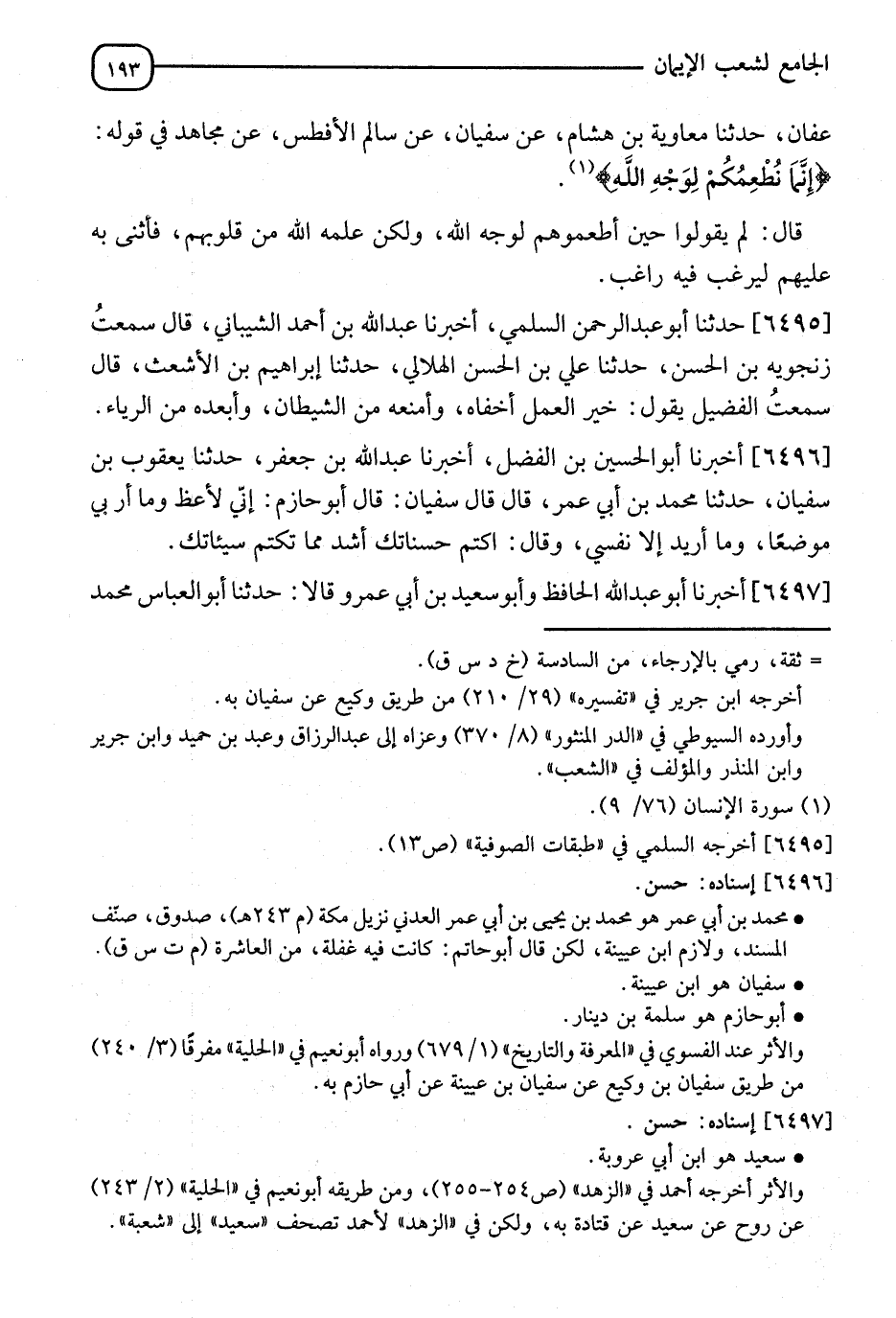 6496 - أَخْبَرَنَا أَبُو الْحُسَيْنِ بْنُ الْفَضْلِ، أَنا عَبْدُ اللهِ بْنُ جَعْفَرٍ، نا يَعْقُوبُ بْنُ سُفْيَانَ، نا مُحَمَّدُ بْنُ أَبِي عُمَرَ، قَالَ سُفْيَانُ: قَالَ أَبُو حَازِمٍ: " إِنِّي §لَأِعِظُ وَمَا أَرَى مَوْضِعًا، وَمَا أُرِيدُ إِلَّا نَفْسِي "، وَقَالَ: " اكْتُمُ حَسَنَاتِكَ أَشَدَّ مِمَّا تَكْتُمُ سَيِّئَاتِكَ "