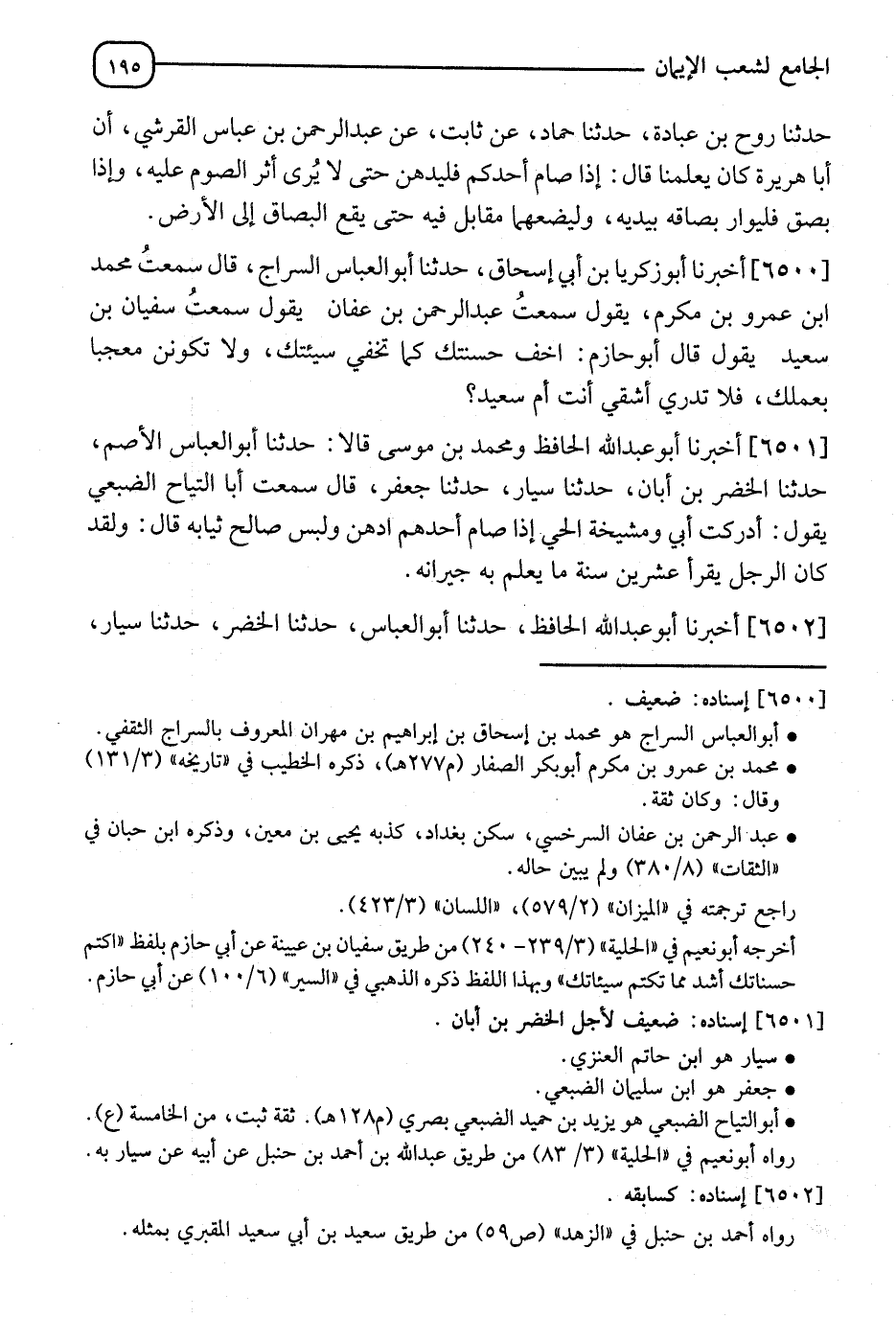 6501 - أَخْبَرَنَا أَبُو عَبْدِ اللهِ الْحَافِظُ، وَمُحَمَّدُ بْنُ مُوسَى، قَالَا: نا أَبُو الْعَبَّاسِ الْأَصَمُّ، نا الْحَضَرُ بْنُ أَبَانَ، نا سَيَّارٌ، نا جَعْفَرٌ، قَالَ: سَمِعْتُ أَبَا التَّيَّاحِ الضُّبَعِيَّ، يَقُولُ: " أَدْرَكْتُ أَبِي وَمَشْيَخَةَ الْحَيِّ §إِذَا صَامَ أَحَدُهُمُ ادَّهَنَ وَلَبِسَ صَالِحَ ثِيَابِهِ، قَالَ: وَلَقَدْ كَانَ الرَّجُلُ إِذَا سَافَرَ سَفَرًا عِشْرِينَ سَنَةً مَا يَعْلَمُ بِهِ جِيرَانُهُ "