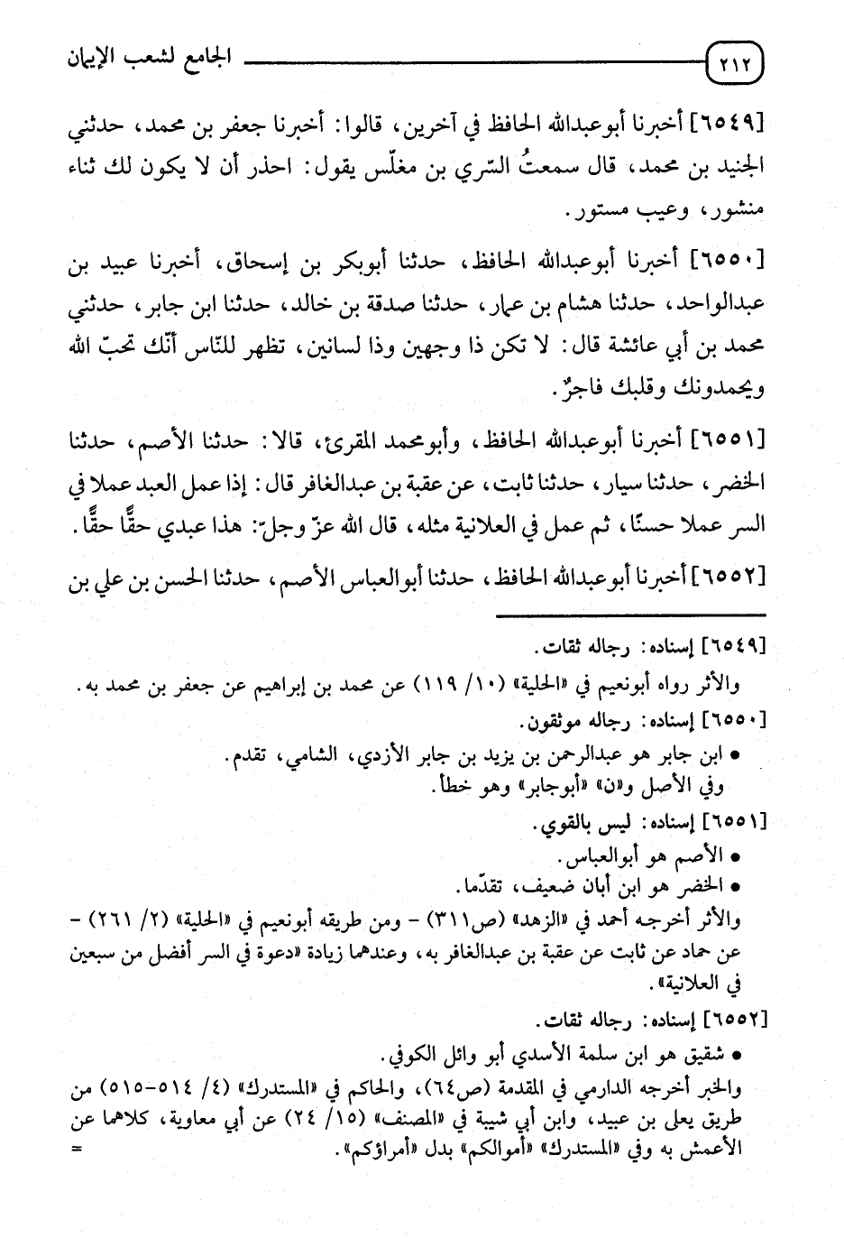 6550 - أَخْبَرَنَا أَبُو عَبْدِ اللهِ الْحَافِظُ، نا أَبُو بَكْرِ بْنُ إِسْحَاقَ، أَنَا عُبَيْدُ بْنُ عَبْدِ الْوَاحِدِ، نا هِشَامُ بْنُ عَمَّارٍ، نا صَدَقَةُ بْنُ خَالِدٍ، نا أَبُو جَابِرٍ، حَدَّثَنِي مُحَمَّدُ بْنُ أَبِي عَائِشَةَ قَالَ: §" لَا تَكُنْ ذَا وَجْهَيْنِ وَذَا لِسَانَيْنِ تُظْهِرُ لِلنَّاسِ أَنَّكَ تُحِبُّ اللهَ، وَيَحْمَدُونَكَ وَقَلْبُكَ فَاجِرٌ "