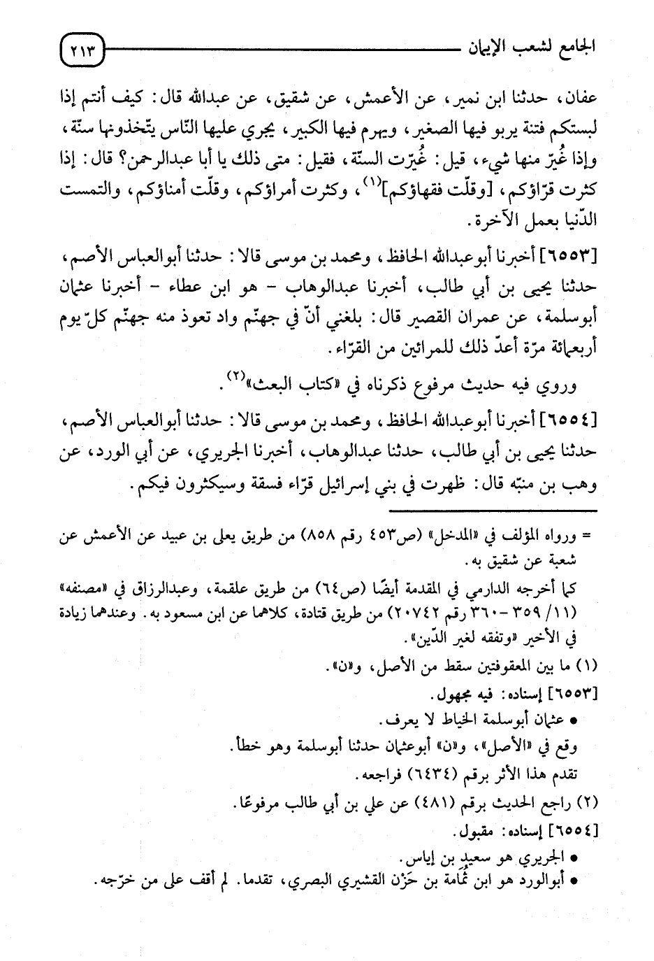 6553 - أَخْبَرَنَا أَبُو عَبْدِ اللهِ الْحَافِظُ، وَمُحَمَّدُ بْنُ مُوسَى قَالَا: نا أَبُو الْعَبَّاسِ الْأَصَمُّ، نا يَحْيَى بْنُ أَبِي طَالِبٍ، أَنَا عَبْدُ الْوَهَّابِ هُوَ ابْنُ عَطَاءٍ أَنَا أَبُو عُثْمَانَ، ثَنَا أَبُو سَلَمَةَ، عَنْ عِمْرَانَ الْقَصِيرِ قَالَ: §" بَلَغَنِي أَنَّ فِي جَهَنَّمَ وَادِيًا تَعَوَّذُ مِنْهُ جَهَنَّمُ فِي كُلِّ يَوْمٍ أَرْبَعَ مِائَةِ مَرَّةً، أَعَدَّ ذَلِكَ لِلْمُرَائِينَ مِنَ الْقُرَّاءِ " وَرُوِيَ فِيهِ حَدِيثٌ مَرْفُوعٌ ذَكَرْنَاهُ فِي كِتَابِ الْبَعْثِ