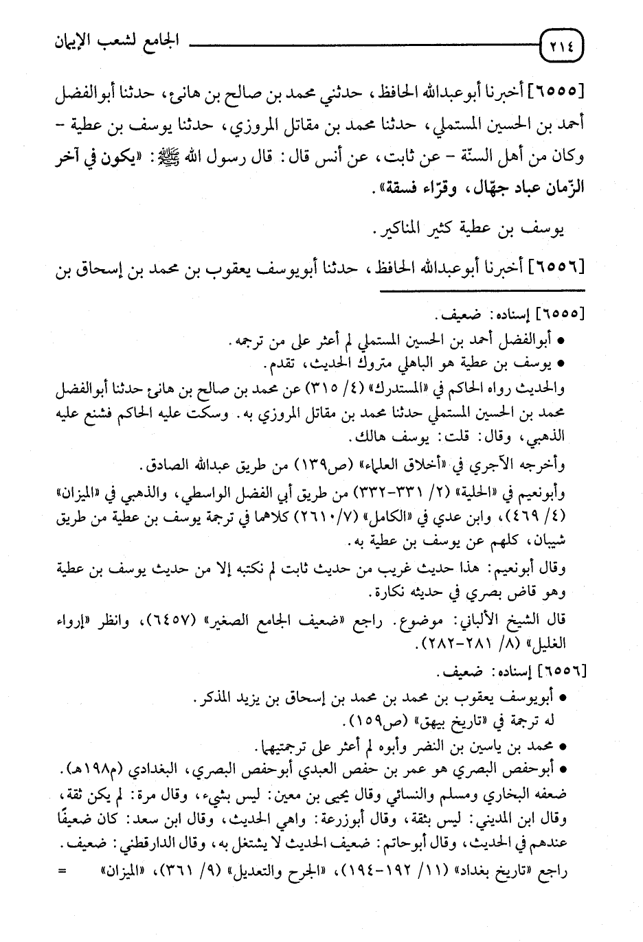 6555 - أَخْبَرَنَا أَبُو عَبْدِ اللهِ الْحَافِظُ، حَدَّثَنِي مُحَمَّدُ بْنُ صَالِحِ بْنِ هَانِئٍ، نا أَبُو الْفَضْلِ أَحْمَدُ بْنُ الْحَسَنِ الْمُسْتَمْلِيُّ، نا مُحَمَّدُ بْنُ مُقَاتِلٍ الْمَرْوَزِيُّ، نا يُوسُفُ بْنُ عَطِيَّةَ وَكَانَ مِنْ أَهْلِ السُّنَّةِ عَنْ ثَابِتٍ، عَنْ أَنَسٍ قَالَ: قَالَ رَسُولُ اللهِ صَلَّى اللَّهُ عَلَيْهِ وَسَلَّمَ: §" يَكُونُ فِي آخِرِ النَّاسِ عُبَّادٌ جُهَّالٌ وَقُرَّاءٌ فَسَقَةٌ " يُوسُفُ بْنُ عَطِيَّةَ كَثِيرُ الْمَنَاكِرِ