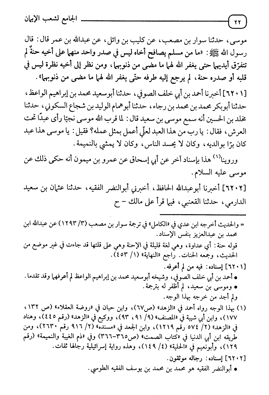 6201 - أَخْبَرَنَا أَحْمَدُ بْنُ أَبِي خَلَفٍ الصُّوفِيُّ، نا أَبُو سَعِيدٍ مُحَمَّدُ بْنُ إِبْرَاهِيمَ الْوَاعِظُ، نا أَبُو بَكْرٍ مُحَمَّدُ بْنُ مُحَمَّدِ بْنِ رَجَاءٍ، نا أَبُو هَمَّامٍ الْوَلِيدُ بْنُ شُجَاعٍ السَّكُونِيُّ، نا مَخْلَدُ بْنُ الْحُسَيْنِ، أَنَّهُ سَمِعَ مُوسَى بْنَ سَعِيدٍ، قَالَ: لَمَّا قَرَّبَ اللهُ مُوسَى نَجِيًّا رَأَى عَبْدًا تَحْتَ الْعَرْشِ، فَقَالَ: يَا رَبِّ، مَنْ هَذَا الْعَبْدُ لِعَلِّي أَعْمَلُ مِثْلَ عَمَلِهِ؟ فَقِيلَ: " يَا مُوسَى، هَذَا §عَبْدٌ كَانَ بَرًّا لِوَالِدَيْهِ، وَكَانَ لَا يَحْسُدُ النَّاسَ، وَكَانَ لَا يَمْشِي بِالنَّمِيمَةِ "، " وَرُوِّينَا هَذَا بِإِسْنَادٍ آخَرَ، عَنْ أَبِي إِسْحَاقَ، عَنْ عَمْرِو بْنِ مَيْمُونٍ أَنَّهُ حَكَى ذَلِكَ، عَنْ مُوسَى عَلَيْهِ السَّلَامُ "