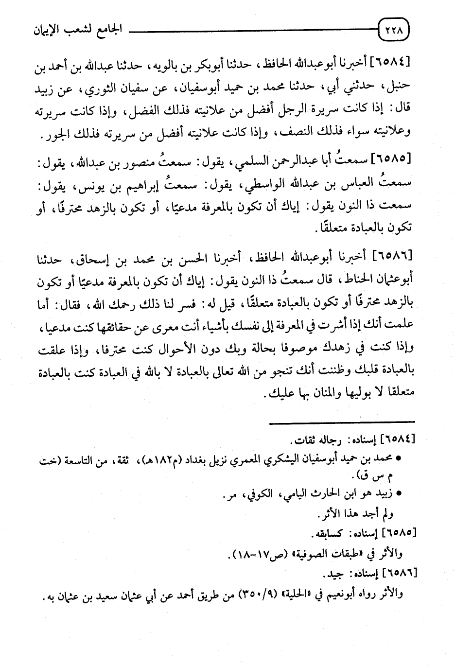 6586 - أَخْبَرَنَا أَبُو عَبْدِ اللهِ الْحَافِظُ، أَنَا الْحَسَنُ بْنُ مُحَمَّدِ بْنِ إِسْحَاقَ، نا أَبُو عُثْمَانَ الْحَنَّاطُ قَالَ: سَمِعْتُ ذَا النُّونِ يَقُولُ: " §إِيَّاكَ أَنْ تَكُونَ بِالْمَعْرِفَةِ مُدَّعِيًا، أَوْ تَكُونَ بِالزُّهْدِ مُحْتَرِفًا، أَوْ تَكُونَ بِالْعِبَادَةِ مُتَعَلِّقًا، فَقِيلَ لَهُ: فَسِّرْ لَنَا ذَلِكَ، رَحِمَهُ اللهُ " فَقَالَ: أَمَا عَلِمْتَ أَنَّكَ إِذَا أَشَرْتَ فِي الْمَعْرِفَةِ إِلَى نَفْسِكَ بِأَشْيَاءَ أَنْتَ مُعَرًّى عَنْ حَقَائِقِهَا كُنْتَ مُدَّعِيًا؟، وَإِذَا كُنْتَ فِي الزُّهْدِ مَوْصُوفًا بِحَالَةٍ وَبِكَ دُونَ الْأَحْوَالِ كُنْتَ مُحْتَرِفًا؟ وَإِذَا عَلَّقْتَ بِالْعِبَادَةِ قَلْبَكَ، وَظَنَنْتَ أَنَّكَ تَنْجُو مِنَ اللهِ تَعَالَى بِالْعِبَادَةِ لَا بِاللهِ فِي الْعِبَادَةِ كُنْتَ بِالْعِبَادَةِ مُتَعَلِّقًا لَا بِوَلِيِّهَا، وَالْمَنَّانُ بِهَا عَلَيْكَ؟