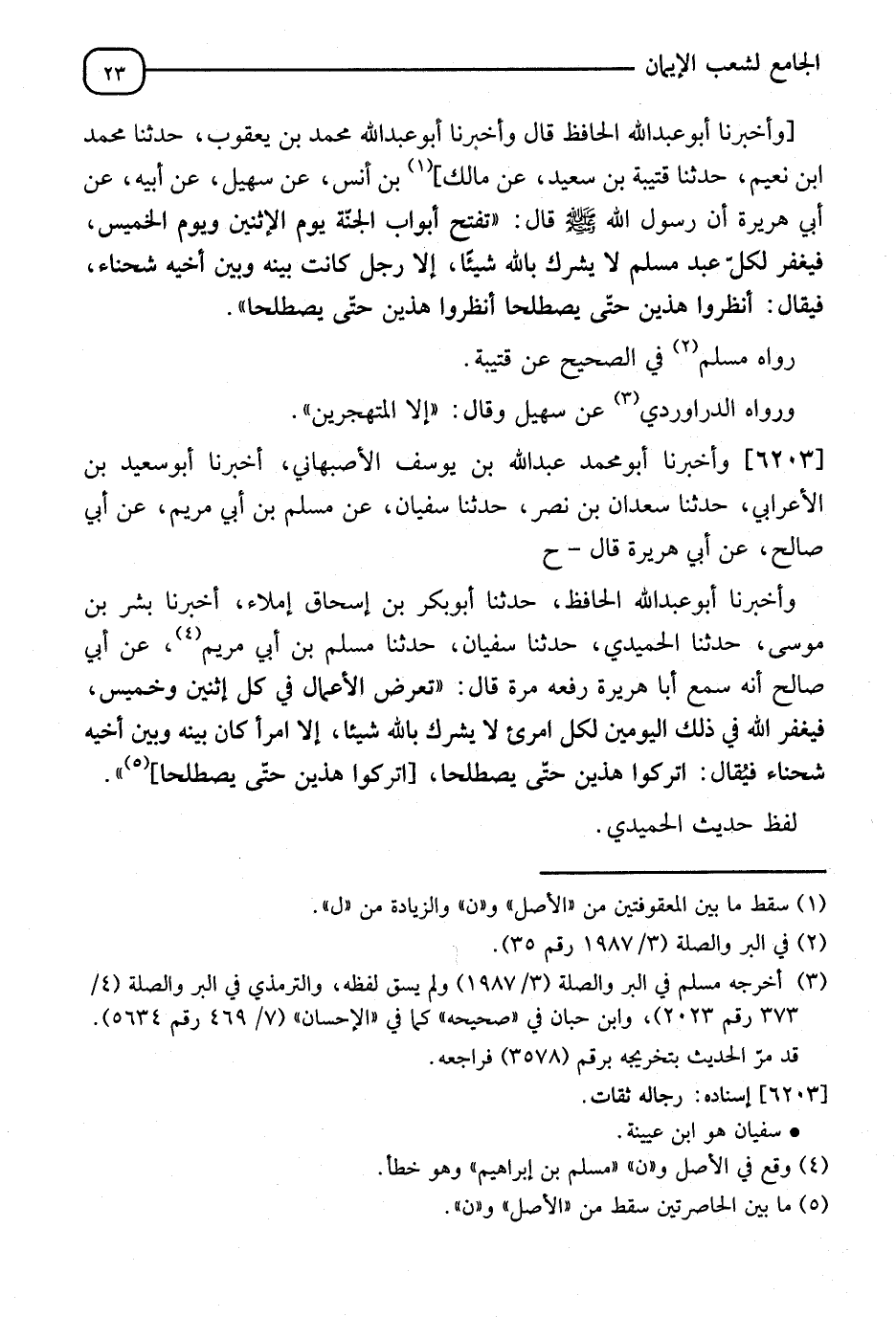 6203 - وَأَخْبَرَنَا أَبُو مُحَمَّدٍ عَبْدُ اللهِ بْنُ يُوسُفَ الْأَصْبَهَانِيُّ، أَنَا أَبُو سَعِيدِ بْنُ الْأَعْرَابِيِّ، نا سَعْدَانُ بْنُ نَصْرٍ، نا سُفْيَانُ، عَنْ مُسْلِمِ بْنِ أَبِي مَرْيَمَ، عَنْ أَبِي صَالِحٍ، عَنْ أَبِي هُرَيْرَةَ، قَالَ: ح، وَأَخْبَرَنَا أَبُو عَبْدِ اللهِ الْحَافِظُ، نا أَبُو بَكْرِ بْنُ إِسْحَاقَ، إِمْلَاءً، أَنَا بِشْرُ بْنُ مُوسَى، نا الْحُمَيْدِيُّ، نا سُفْيَانُ، نا مُسْلِمُ بْنُ إِبْرَاهِيمَ، عَنِ ابْنِ أَبِي صَالِحٍ، أَنَّهُ سَمِعَ أَبَا هُرَيْرَةَ، رَفَعَهُ مَرَّةً، قَالَ: " §تُعْرَضُ الْأَعْمَالُ فِي كُلِّ اثْنَيْنِ وَخَمِيسٍ، فَيَغْفِرُ اللهُ فِي ذَلِكَ الْيَوْمَيْنِ لِكُلِّ امْرِئٍ لَا يُشْرِكُ بِاللهِ شَيْئًا إِلَّا امْرَأً كَانَتْ بَيْنَهُ وَبَيْنَ أَخِيهِ شَحْنَاءُ، فَيُقَالُ: اتْرُكُوا هَذَيْنِ حَتَّى يَصْطَلِحَا ". لَفْظُ حَدِيثِ الْحُمَيْدِيِّ، -[24]- رَوَاهُ مُسْلِمٌ فِي الصَّحِيحِ، عَنِ ابْنِ أَبِي مَرْيَمَ، عَنْ سُفْيَانَ. وَقَالَ: " اتْرُكُوا هَذَيْنِ ". قَالَ الْحَلِيمِيُّ رَحِمَهُ اللهُ: وَمَعْنَى هَذَا أَنَّ مَنْ لَمْ يَكُنْ مُشْرِكًا فَقَدْ تَنَالُهُ الْمَغْفِرَةُ مَا لَمْ يَكُنْ مُهَاجِرًا لِأَخِيهِ الْمُسْلِمِ، فَإِنَّهُ إِذَا كَانَ كَذَلِكَ لَمْ تَنَلْهُ مَغْفِرَةٌ، وَإِنْ لَمْ يَكُنْ مُشْرِكًا وَلَيْسَ الْمَعْنَى أَنَّهُ لَا يَبْقَى أَحَدٌ دُونَ الْمُشْرِكِينَ إِلَّا وَيَغْفِرُ لَهُ كُلَّ اثْنَيْنِ وَخَمِيسٍ إِنَّمَا وَجْهُ الْحَدِيثِ مَا بَيَّنْتُ