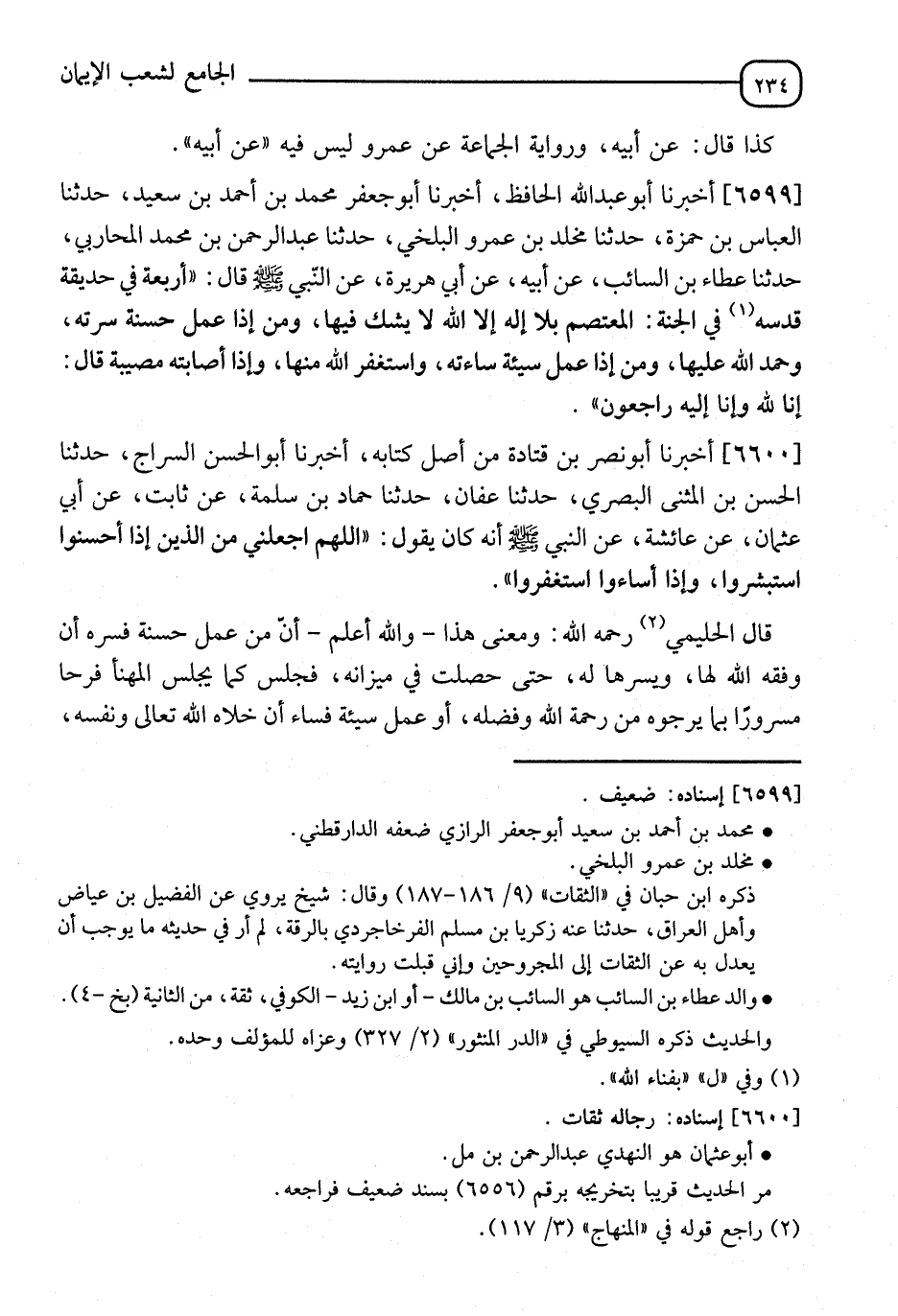6600 - أَخْبَرَنَا أَبُو نَصْرِ بْنُ قَتَادَةَ، مِنْ أَصْلِ كِتَابِهِ، أَنَا أَبُو الْحَسَنِ مُحَمَّدُ بْنُ الْحَسَنِ السَّرَّاجُ، نا الْحُسَيْنُ بْنُ الْمُثَنَّى الْبَصْرِيُّ، نا عَفَّانُ، نا حَمَّادُ بْنُ سَلَمَةَ، عَنْ ثَابِتٍ، عَنْ أَبِي عُثْمَانَ، عَنْ عَائِشَةَ عَنِ النَّبِيِّ صَلَّى اللَّهُ عَلَيْهِ وَسَلَّمَ أَنَّهُ كَانَ يَقُولُ: " §اللهُمَّ اجْعَلْنِي مِنَ الَّذِينَ إِذَا أَحْسَنُوا اسْتَبْشَرُوا، وَإِذَا أَسَاءُوا اسْتَغْفِرُوا " قَالَ الْحَلِيمِيُّ رَحِمَهُ اللهُ: وَمَعْنَى هَذَا، وَاللهُ أَعْلَمُ، أَنَّ مَنْ عَمِلَ حَسَنَةً فَسَّرَهُ أَنْ وَفَّقَهُ اللهُ تَعَالَى لَهَا، وَيَسَّرَهَا لَهُ حَتَّى حَصَلَتْ فِي مِيزَانِهِ، فَجَلَسَ كَمَا يَجْلِسُ الْمُهَنَّأُ فَرِحًا مَسْرُورًا بِمَا يَرْجُوهُ مِنْ رَحْمَةِ اللهِ وَفَضْلِهِ، أَوْ عَمِلَ سَيِّئَةً فَسَاءَتْهُ أَنْ خَلَا بِاللهِ تَعَالَى وَنَفْسِهِ -[235]- حَتَّى عَمِلَ بِمَا سَوَّلَهُ لَهُ الشَّيْطَانُ، وَجَلَسَ كَمَا يَجْلِسُ الْمُصَابُ مَهْمُومًا كَئِيبًا حَزِينًا حَيَاءً مِنَ اللهِ تَعَالَى، وَخَوْفًا مِنْ مُؤَاخَذَتِهِ، فَذَلِكَ دَلِيلٌ عَلَى صِدْقِ إِيمَانِهِ، وَخُلُوصِ اعْتِقَادِهِ، فَإِنَّ الثِّقَةَ بِالْوَعْدِ وَالْوَعِيدِ لَا يَكُونُ إِلَّا مِنْ قُوَّةِ التَّصْدِيقِ بِاللهِ وَرَسُولِهِ " قَالَ أَحْمَدُ رَحِمَهُ اللهُ: وَلِذَا جَاءَ هَذَا التَّفْسِيرُ مَرْفُوعًا بِلَفْظٍ مُوجَزٍ قَالَ: إِنَّ الْمُؤْمِنَ إِذَا عَمِلَ حَسَنَةً رَجَا ثَوَابَهَا، وَإِذَا عَمِلَ سَيِّئَةً خَافَ عِقَابَهَا