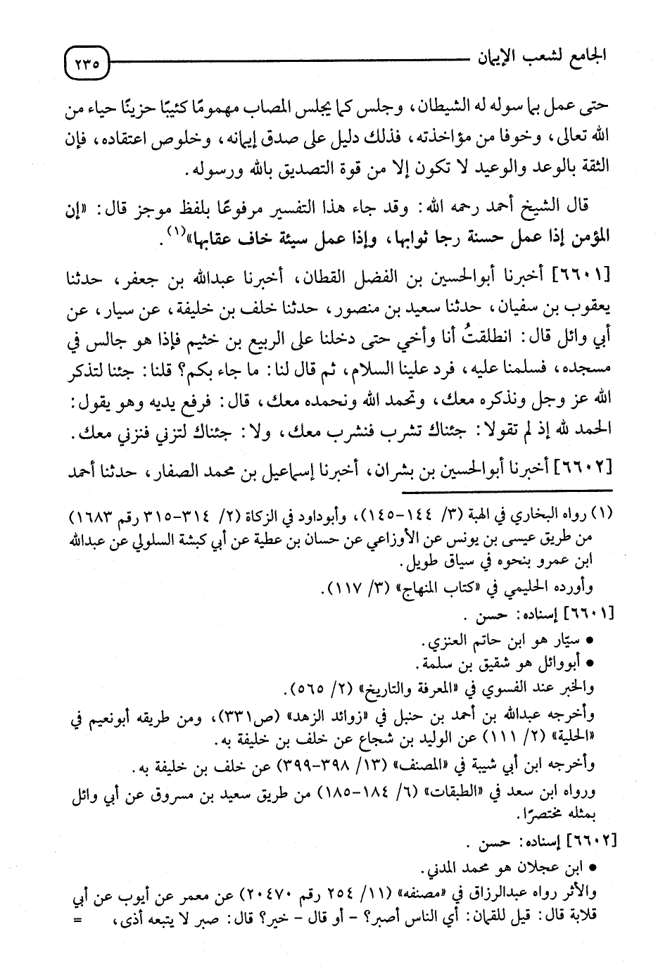 6601 - أَخْبَرَنَا أَبُو الْحُسَيْنِ الْفَضْلُ الْقَطَّانُ، أَنَا عَبْدُ اللهِ بْنُ جَعْفَرٍ، نا يَعْقُوبُ بْنُ سُفْيَانَ، نا سَعِيدُ بْنُ مَنْصُورٍ، نا خَلَفُ بْنُ خَلِيفَةَ، عَنْ سَيَّارٍ، عَنْ أَبِي وَائِلٍ قَالَ: " §انْطَلَقْتُ أَنَا وَأَخِي حَتَّى دَخَلْنَا عَلَى الرَّبِيعِ بْنِ خُثَيْمٍ، فَإِذَا هُوَ جَالِسٌ فِي مَسْجِدِهِ، فَسَلَّمْنَا عَلَيْهِ فَرَدَّ عَلَيْنَا السَّلَامَ، ثُمَّ قَالَ: مَا جَاءَ بِكُمْ؟ قُلْنَا: جِئْنَا لِتَذْكُرَ اللهَ عَزَّ وَجَلَّ وَنَذْكُرُهُ مَعَكَ، وَتَحْمَدُ اللهَ وَنَحْمَدُهُ مَعَكَ قَالَ: فَرَفَعَ يَدَيْهِ يَقُولُ: الْحَمْدُ لِلَّهِ، لِمْ تَقُولَا: جِئْنَاكَ تَشْرَبُ فَنَشْرَبُ مَعَكَ، وَلَا جِئْنَاكَ تَزْنِي فَنَزْنِي مَعَكَ "
