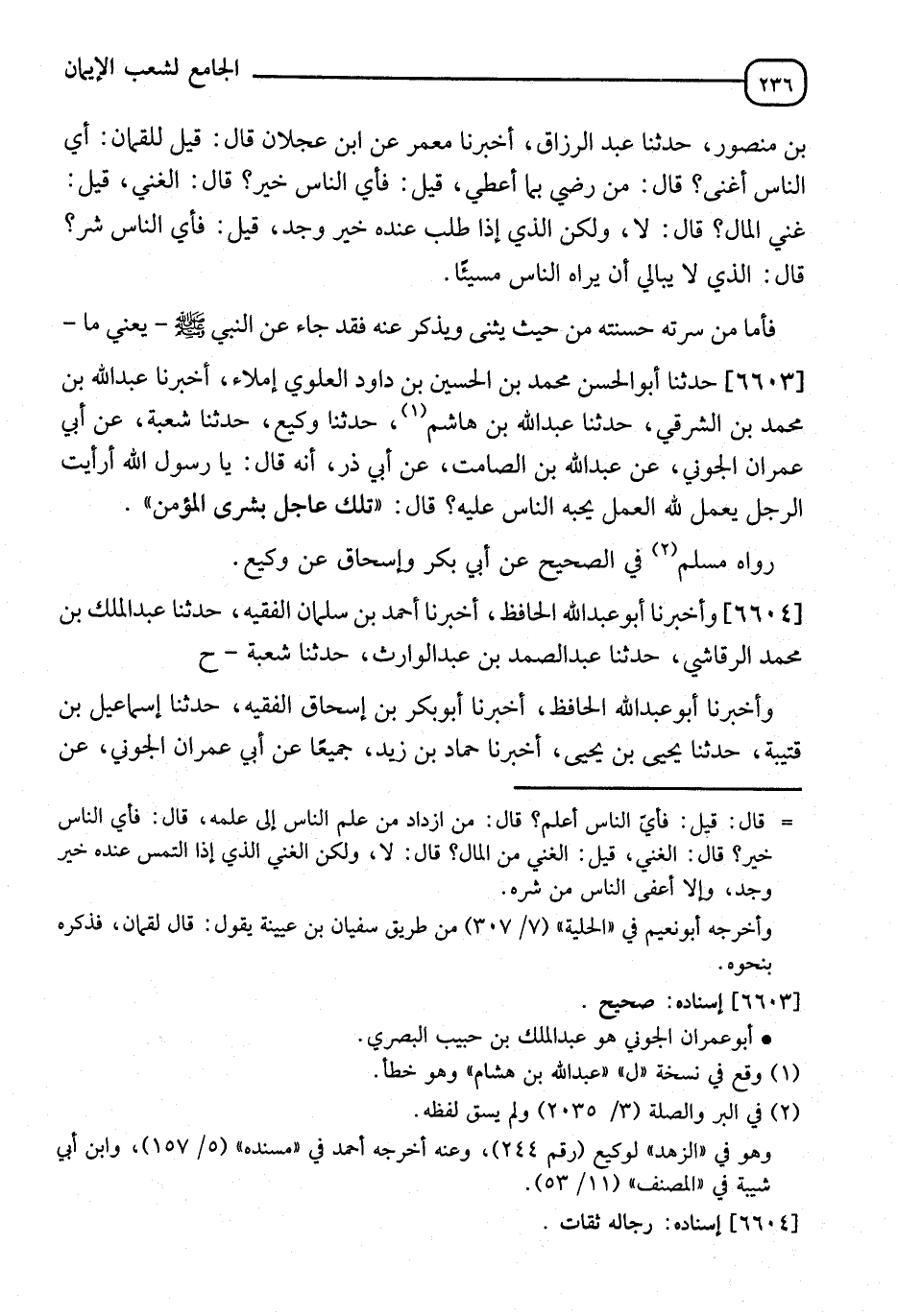 6603 - حَدَّثَنَا أَبُو الْحَسَنِ مُحَمَّدُ بْنُ الْحُسَيْنِ بْنِ دَاوُدَ الْعَلَوِيُّ إِمْلَاءً، أَنا عَبْدُ اللهِ بْنِ مُحَمَّدِ بْنِ الْحَسَنِ الشَّرْقِيُّ، نا عَبْدُ اللهِ بْنُ هَاشِمٍ، نا وَكِيعٌ، نا شُعْبَةُ، عَنْ أَبِي عِمْرَانَ الْجَوْنِيِّ، عَنْ عَبْدِ اللهِ بْنِ الصَّامِتِ، عَنْ أَبِي ذَرٍّ أَنَّهُ قَالَ: يَا رَسُولَ اللهِ، أَرَأَيْتَ الرَّجُلَ يَعْمَلُ لِلَّهِ الْعَمَلَ يُحِبُّهُ النَّاسُ عَلَيْهِ؟ قَالَ: §" تِلْكَ عَاجِلُ بُشْرَى الْمُؤْمِنِ " رَوَاهُ مُسْلِمٌ عَنْ أَبِي بَكْرٍ، وَإِسْحَاقُ، عَنْ وَكِيعٍ