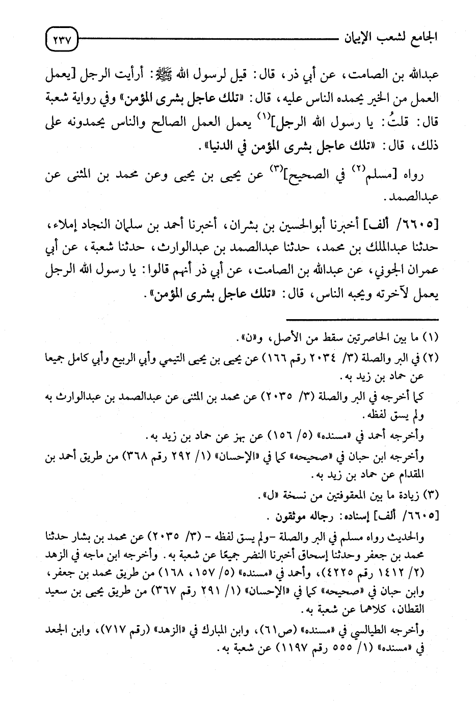 6605 - (ألف) أَخْبَرَنَا أَبُو الْحُسَيْنِ بْنُ بِشْرَانَ، أَنا أَحْمَدُ بْنُ سَلْمَانَ النِّجَادُ، إِمْلَاءً، نا عَبْدُ الْمَلِكِ بْنُ مُحَمَّدٍ، نا عَبْدُ الصَّمَدِ بْنُ عَبْدِ الْوَارِثِ، نا شُعْبَةُ، عَنْ أَبِي عِمْرَانَ الْجَوْنِيِّ، عَنْ عَبْدِ اللهِ بْنِ الصَّامِتِ، عَنْ أَبِي ذَرٍّ أَنَّهُمْ قَالُوا: يَا رَسُولَ اللهِ، الرَّجُلُ يَعْمَلُ لِآخِرَتِهِ وَيُحِبُّهُ النَّاسُ؟ قَالَ: §" تِلْكَ عَاجِلُ بُشْرَى الْمُؤْمِنِ " -[238]-