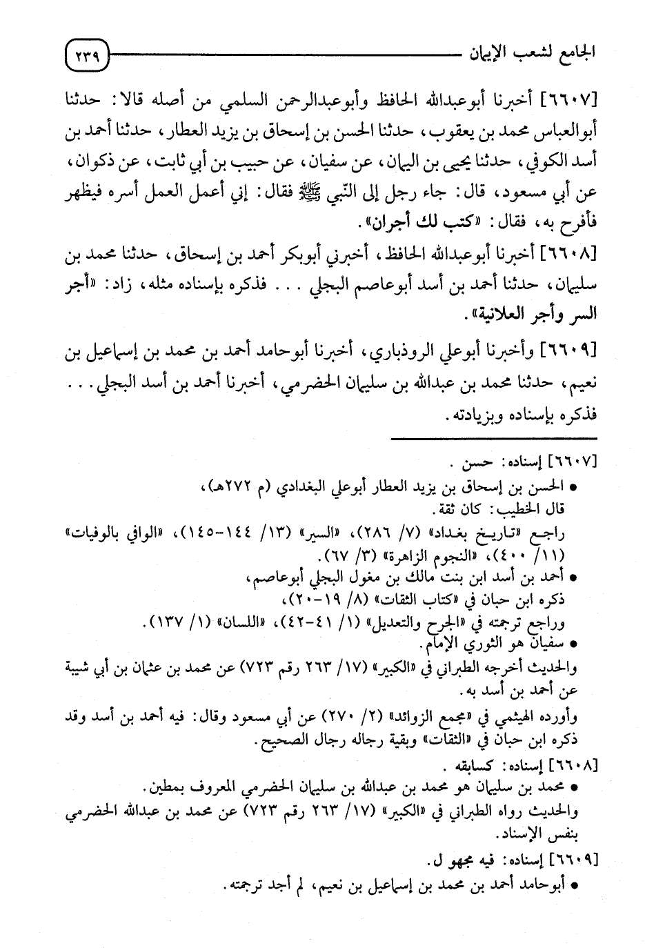 6607 - أَخْبَرَنَا أَبُو عَبْدِ اللهِ الْحَافِظُ، وَأَبُو عَبْدِ الرَّحْمَنِ السَّلَمِيُّ، مِنْ أَصْلِهِ قَالَا: نا أَبُو الْعَبَّاسِ مُحَمَّدُ بْنُ يَعْقُوبَ، نا الْحَسَنُ بْنُ إِسْحَاقَ بْنِ يَزِيدَ الْعَطَّارُ، نا أَحْمَدُ بْنُ أَسَدٍ الْكُوفِيُّ، نا يَحْيَى بْنُ الْيَمَانِ، عَنْ سُفْيَانَ، عَنْ حَبِيبِ بْنِ أَبِي ثَابِتٍ، عَنْ ذَكْوَانَ، عَنِ أَبِيِ مَسْعُودٍ قَالَ: جَاءَ رَجُلٌ إِلَى النَّبِيِّ صَلَّى اللَّهُ عَلَيْهِ وَسَلَّمَ فَقَالَ: إِنِّي أَعْمَلُ الْعَمَلَ أُسِرُّهُ فَيَظْهَرُ فَأَفْرَحُ بِهِ؟ فَقَالَ: " §كُتِبَ لَكَ أَجْرَانِ "