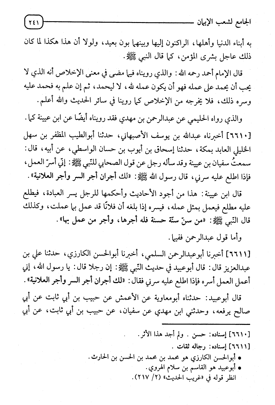6610 - أَخْبَرَنا عَبْدُ اللهِ بْنُ يُوسُفَ الْأَصْبَهَانِيُّ، نا أَبُو الطِّيبِ الْمُظَفَّرُ بْنُ سَهْلٍ الْخَلِيلِيُّ الْقَائِدُ، بِمَكَّةَ، نا إِسْحَاقُ بْنُ أَيُّوبَ بْنِ حَسَّانَ الْوَاسِطِيُّ، عَنْ أَبِيهِ قَالَ: سَمِعْتُ سُفْيَانَ بْنَ عُيَيْنَةَ، وَقَدْ سَأَلَهُ رَجُلٌ عَنْ قَوْلِ الصَّحَابِيِّ لِلنَّبِيِّ صَلَّى اللَّهُ عَلَيْهِ وَسَلَّمَ: إِنِّي لَأُسِرُّ الْعَمَلَ، فَإِذَا اطُّلِعَ عَلَيْهِ سَرَّنِي؟ قَالَ رَسُولُ اللهِ صَلَّى اللَّهُ عَلَيْهِ وَسَلَّمَ: " §لَكَ أَجْرَانِ، أَجْرُ السِّرِّ، وَأَجْرُ الْعَلَانِيَةِ "