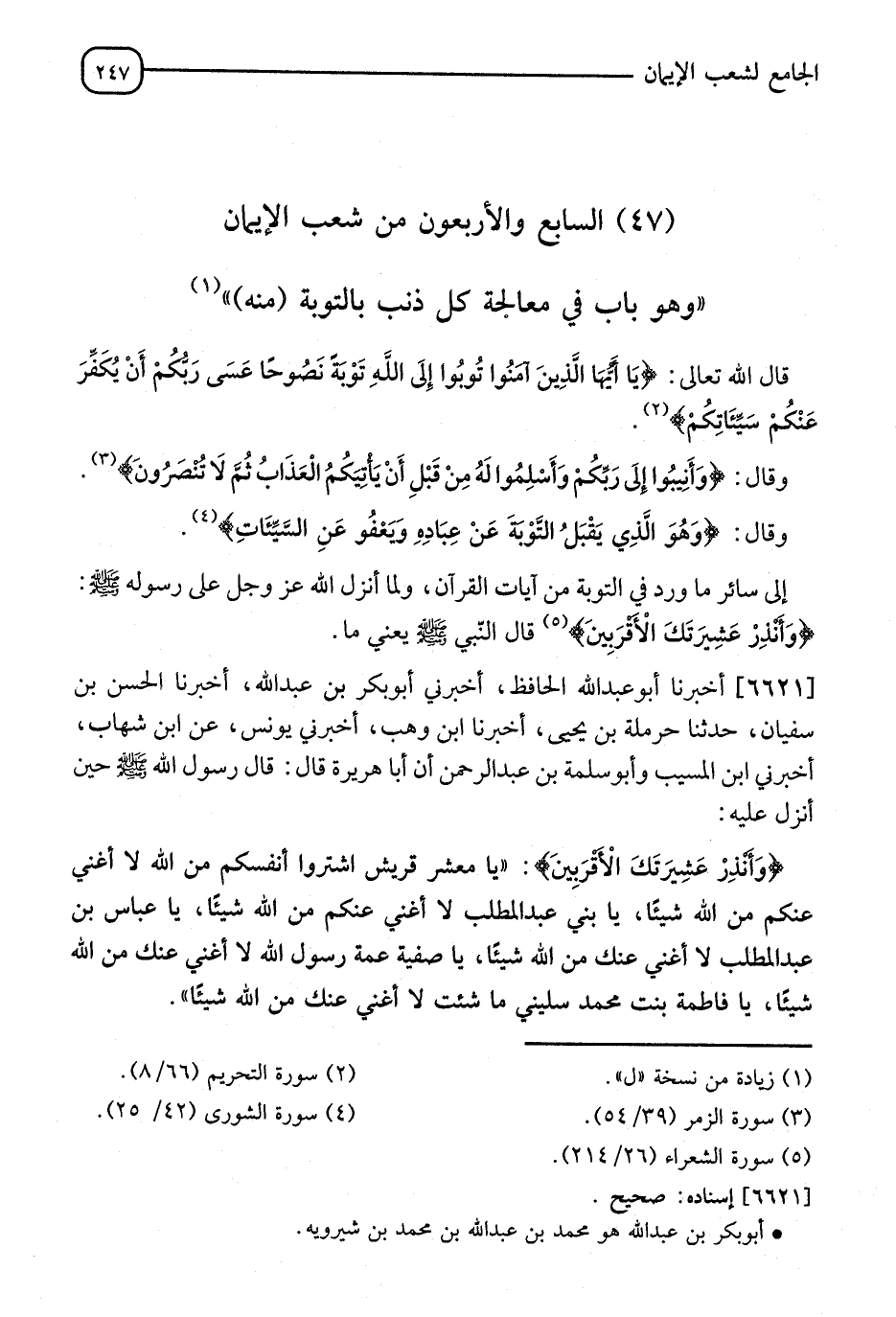 §وَهُوَ بَابٌ فِي مُعَالَجَةِ كُلِّ ذَنْبٍ بِالتَّوْبَةِ قَالَ اللهُ تَعَالَى: {يَا أَيُّهَا الَّذِينَ آمَنُوا تُوبُوا إِلَى اللهِ تَوْبَةً نَصُوحًا عَسَى رَبُّكُمْ أَنْ يُكَفِّرَ عَنْكُمْ سَيِّئَاتِكُمْ} [التحريم: 8] وَقَالَ: {وَأَنِيبُوا إِلَى رَبِّكُمْ وَأَسْلِمُوا لَهُ مِنْ قَبْلِ أَنْ يَأْتِيَكُمُ الْعَذَابُ ثُمَّ لَا تُنْصَرُونَ} [الزمر: 54] وَقَالَ: {وَهُوَ الَّذِي يَقْبَلُ التَّوْبَةَ عَنْ عِبَادِهِ وَيَعْفُو عَنِ السَّيِّئَاتِ} [الشورى: 25] إِلَى سَائِرِ مَا وَرَدَ فِي التَّوْبَةِ مِنْ آيَاتِ اللهِ، وَلَمَّا أَنْزَلَ اللهُ عَلَى رَسُولِهِ صَلَّى اللَّهُ عَلَيْهِ وَسَلَّمَ {وَأَنْذِرْ عَشِيرَتَكَ الْأَقْرَبِينَ} [الشعراء: 214] قَالَ النَّبِيُّ صَلَّى اللَّهُ عَلَيْهِ وَسَلَّمَ يَعْنِي.