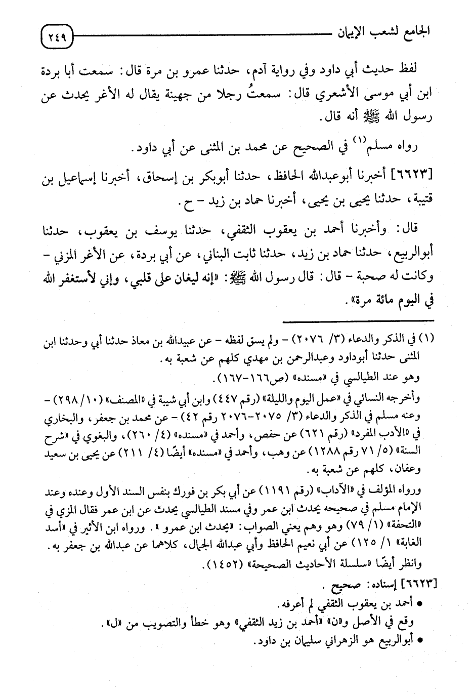 6623 - أَخْبَرَنَا أَبُو عَبْدِ اللهِ الْحَافِظُ، نا أَبُو بَكْرِ بْنُ إِسْحَاقَ، نا إِسْمَاعِيلُ بْنُ قُتَيْبَةَ، نا يَحْيَى بْنُ يَحْيَى، أَنَا حَمَّادُ بْنُ زَيْدٍ، وَأَخْبَرَنَا أَحْمَدُ بْنُ زَيْدٍ الثَّقَفِيُّ، نا يُوسُفُ بْنُ يَعْقُوبَ، نا أَبُو الرَّبِيعِ، نا حَمَّادُ بْنُ زَيْدٍ، نا ثَابِتُ الْبُنَانِيُّ، عَنْ أَبِي بُرْدَةَ، عَنِ الْأَغَرِّ الْمُزَنِيِّ، وَكَانَتْ لَهُ صُحْبَةٌ قَالَ: قَالَ رَسُولُ اللهِ صَلَّى اللَّهُ عَلَيْهِ وَسَلَّمَ: " إِنَّهُ §لَيُغَانُ عَلَى قَلْبِي، وَإِنِّي لَأَسْتَغْفِرُ اللهَ فِي الْيَوْمِ مِائَةَ مَرَّةٍ " -[250]- رَوَاهُ مُسْلِمٌ فِي الصَّحِيحِ، عَنْ يَحْيَى بْنِ يَحْيَى، وَأَبِي الرَّبِيعِ وَرُوِّينَا فِي الْحَدِيثِ الثَّابِتِ عَنِ ابْنِ شِهَابٍ الزُّهْرِيِّ، أَخْبَرَنِي أَبُو سَلَمَةَ بْنُ عَبْدِ الرَّحْمَنِ قَالَ: قَالَ أَبُو هُرَيْرَةَ: سَمِعْتُ رَسُولَ اللهِ صَلَّى اللَّهُ عَلَيْهِ وَسَلَّمَ يَقُولُ: " وَاللهِ إِنِّي لَأَسْتَغْفِرُ اللهَ وَأَتُوبُ فِي الْيَوْمِ أَكْثَرَ مِنْ سَبْعِينَ مَرَّةً "