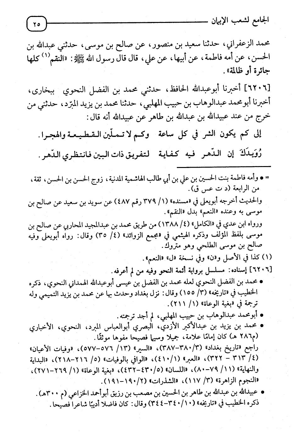6206 - أَخْبَرَنَا أَبُو عَبْدِ اللهِ الْحَافِظُ، حَدَّثَنِي مُحَمَّدُ بْنُ الْفَضْلِ النَّحْوِيُّ، بِبُخَارَى، أَنَا أَبُو مُحَمَّدٍ عَبْدُ الْوَهَّابِ بْنُ حَبِيبٍ الْمُهَلَّبِيُّ، نا مُحَمَّدُ بْنُ يَزِيدَ الْمُبَرِّدُ، حَدَّثَنِي جَرِيرٌ، خَرَجَ مِنْ عِنْدِ عُبَيْدِ اللهِ بْنِ عَبْدِ اللهِ بْنِ طَاهِرٍ، عَنْ عَبْدِ اللهِ، أَنَّهُ قَالَ:"
