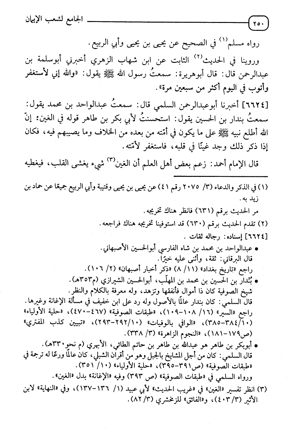 6624 - أَخْبَرَنَا أَبُو عَبْدِ الرَّحْمَنِ السَّلَمِيُّ قَالَ: سَمِعْتُ عَبْدَ الْوَاحِدِ بْنَ مُحَمَّدٍ يَقُولُ: سَمِعْتُ بُنْدَارًا، عَنِ الْحُسَيْنِ يَقُولُ: اسْتَحْسَنْتُ لِأَبِي بَكْرِ بْنِ طَاهِرٍ قَوْلَهُ فِي الْغَيْنِ: " إِنَّ اللهَ §أَطْلَعَ نَبِيَّهُ صَلَّى اللَّهُ عَلَيْهِ وَسَلَّمَ عَلَى مَا يَكُونُ فِي أُمَّتِهِ مِنْ بَعْدِهِ مِنَ الْخِلَافِ، وَمَا يُصِيبُهُمْ فِيهِ، وَكَانَ إِذَا ذَكَرَ ذَلِكَ وَجَدَ غَيْنًا فِي قَلْبِهِ فَاسْتَغْفَرَ لِأُمَّتِهِ " قَالَ الْإِمَامُ أَحْمَدُ: زَعَمَ بَعْضُ أَهْلِ الْعِلْمِ أَنَّ الْغَيٍنَ شَيْءٌ يَغْشَى الْقَلْبَ فَيُغَطِّيهِ -[251]- بَعْضَ التَّغْطِيَةِ وَيَحْجِبُهُ عَمَّا يُشَاهِدُهُ، وَهُوَ كَالْغَيْمِ الرَّقِيقِ الَّذِي يَعْرِضُ فِي الْهَوَاءِ، فَلَا يَكَادُ يَحْجِبُ عَيْنَ الشَّمْسِ، وَلَا يَمْنَعُ ضَوْءَهَا، وَالنَّبِيُّ صَلَّى اللَّهُ عَلَيْهِ وَسَلَّمَ ذَكَرَ أَنَّهُ يَغْشَى قَلْبَهُ مَا هَذِهِ صِفَتُهُ، وَذَكَرَ أَنَّهُ لِيَسْتَغْفِرَ اللهَ فِي كُلِّ يَوْمٍ مِائَةَ مَرَّةٍ