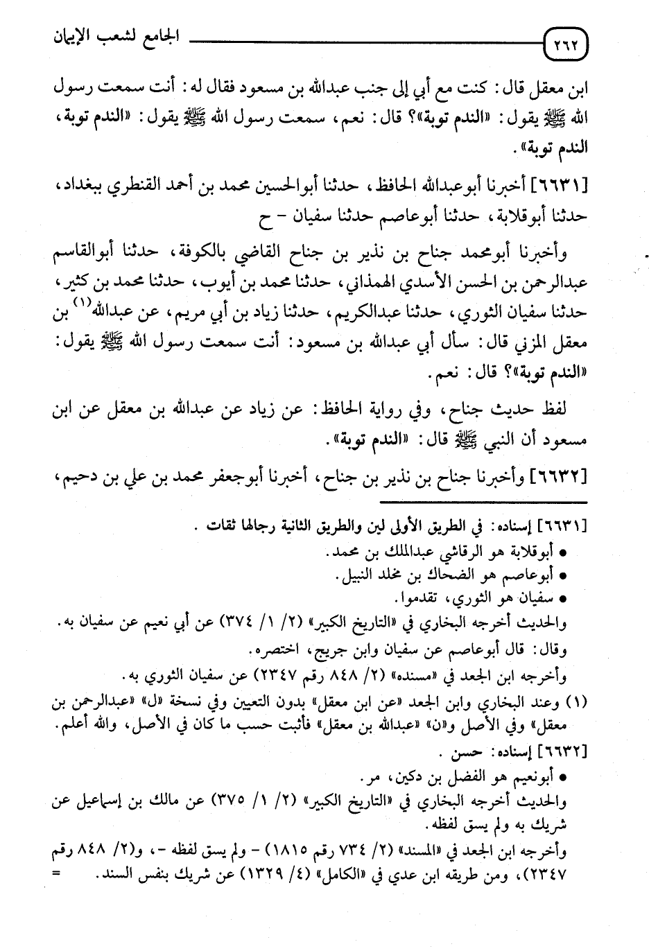 6631 - أَخْبَرَنَا أَبُو عَبْدِ اللهِ الْحَافِظُ، أَنَا أَبُو الْحُسَيْنِ مُحَمَّدُ بْنُ أَحْمَدَ الْقَنْطَرِيُّ، بِبَغْدَادَ، نا أَبُو قِلَابَةَ، نا أَبُو عَاصِمٍ، نا سُفْيَانُ، وَأَخْبَرَنَا أَبُو مُحَمَّدٍ جَنَاحُ بْنُ نَذِيرِ بْنِ جَنَاحٍ الْقَاضِي، بِالْكُوفَةِ، نا أَبُو الْقَاسِمِ عَبْدُ الرَّحْمَنِ بْنُ الْحَسَنِ الْأَسَدِيُّ الْهَمْدَانِيُّ، نا مُحَمَّدُ بْنُ أَيُّوبَ، نا مُحَمَّدُ بْنُ كَثِيرٍ، نا سُفْيَانُ الثَّوْرِيُّ، نا عَبْدُ الْكَرِيمِ، نا زِيَادُ بْنُ أَبِي مَرْيَمَ، عَنْ عَبْدِ اللهِ بْنِ مَعْقِلٍ الْمُزَنِيِّ قَالَ: سَأَل أَبِي عَبْدَ اللهِ بْنَ مَسْعُودٍ: أَنْتَ سَمِعْتَ رَسُولَ اللهِ صَلَّى اللَّهُ عَلَيْهِ وَسَلَّمَ يَقُولُ: " §النَّدَمُ تَوْبَةٌ " قَالَ: نَعَمْ لَفْظُ حَدِيثِ جَنَاحٍ، وَفِي رِوَايَةِ الْحَافِظِ، عَنْ زِيَادٍ، عَنْ عَبْدِ اللهِ بْنِ مَعْقِلٍ، عَنِ ابْنِ مَسْعُودٍ، أَنَّ النَّبِيَّ صَلَّى اللَّهُ عَلَيْهِ وَسَلَّمَ قَالَ: " النَّدَمُ تَوْبَةٌ "
