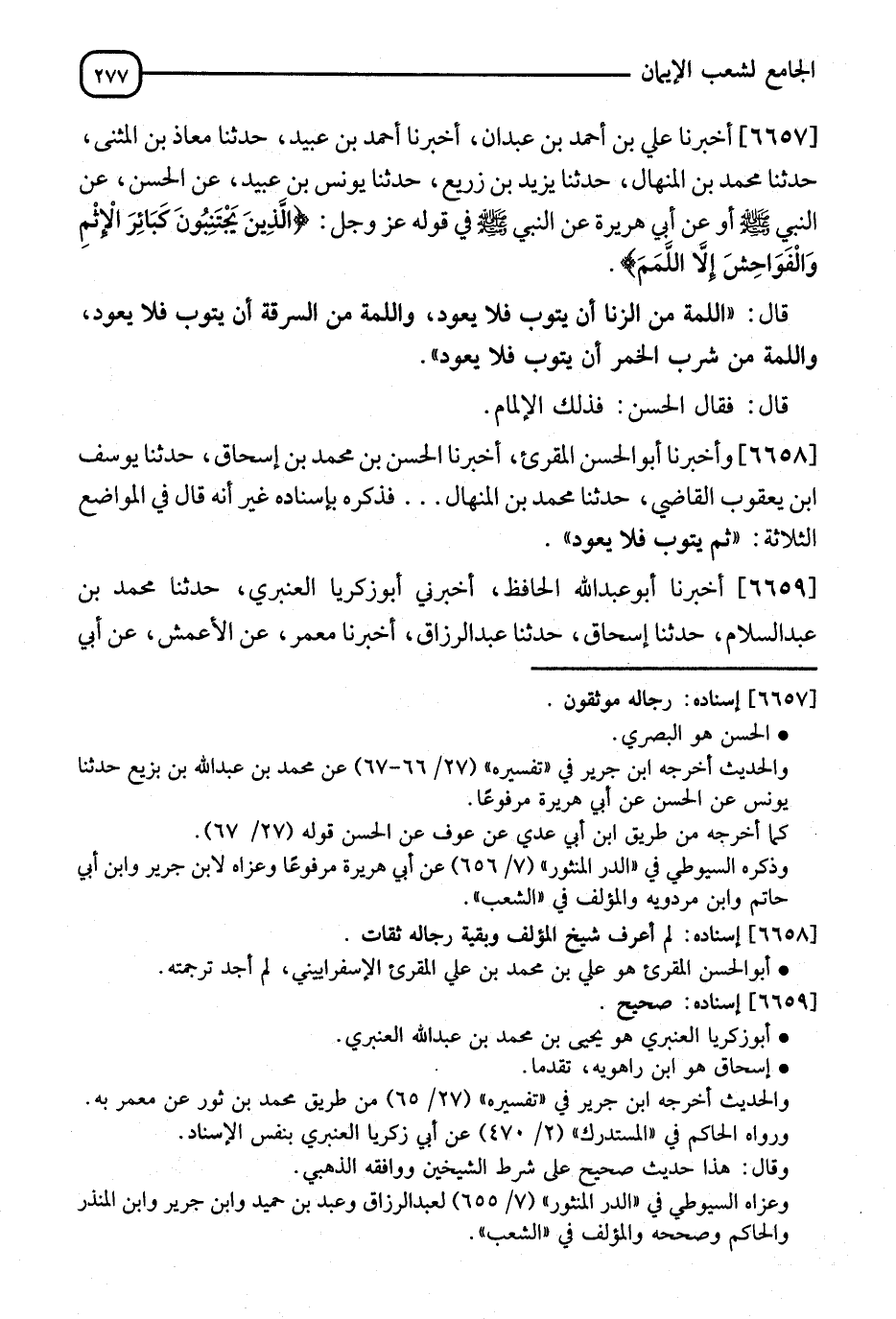 6657 - أَخْبَرَنَا عَلِيُّ بْنُ أَحْمَدَ بْنِ عَبْدِانَ، أَنَا أَحْمَدُ بْنُ عُبَيْدٍ، نا مُعَاذُ بْنُ الْمُثَنَّى، نا مُحَمَّدُ بْنُ الْمِنْهَالِ، نا يَزِيدُ بْنُ زُرَيْعٍ، نا يُونُسُ بْنُ عُبَيْدٍ، عَنِ الْحَسَنِ عَنِ النَّبِيِّ صَلَّى اللَّهُ عَلَيْهِ وَسَلَّمَ، أَوْ عَنْ أَبِي هُرَيْرَةَ عَنِ النَّبِيِّ صَلَّى اللَّهُ عَلَيْهِ وَسَلَّمَ فِي قَوْلِهِ عَزَّ وَجَلَّ: {الَّذِينَ يَجْتَنِبُونَ كَبَائِرَ الْإِثْمِ وَالْفَوَاحِشَ إِلَّا اللَّمَمَ} [النجم: 32] قَالَ: " §اللَّمَّةُ مِنَ الزِّنَا، أَنْ يَتُوبَ فَلَا يَعُودُ، وَاللَّمَّةُ مِنَ السَّرِقَةِ أَنْ يَتُوبَ فَلَا يَعُودُ، وَاللَّمَّةُ مِنْ شُرْبِ الْخَمْرِ أَنْ يَتُوبَ فَلَا يَعُودُ " قَالَ: فَقَالَ الْحَسَنُ: فَذَلِكَ الْإِلْمَامُ.