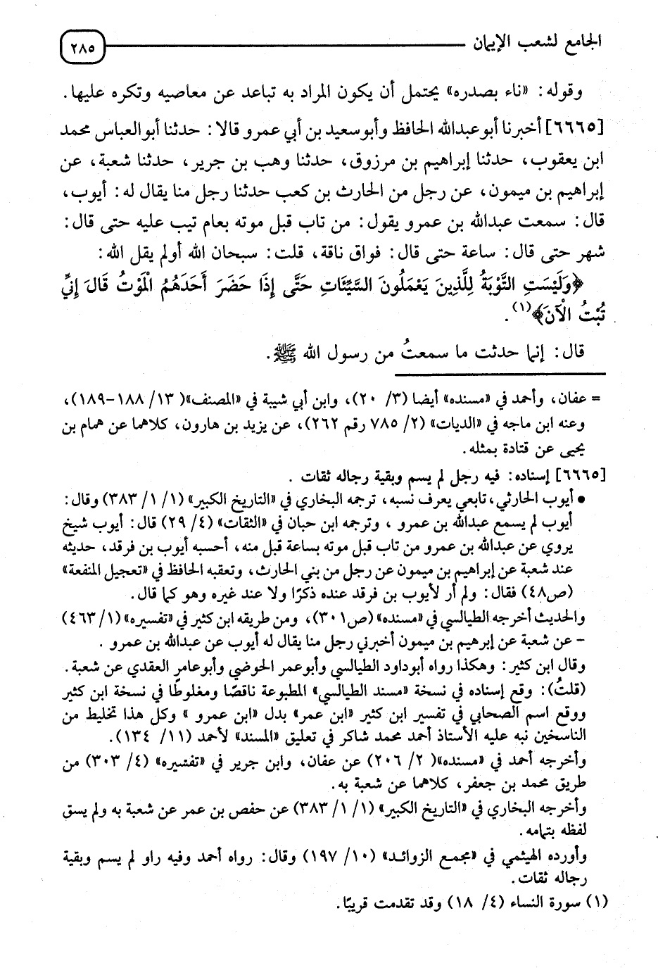 6665 - أَخْبَرَنَا أَبُو عَبْدِ اللهِ الْحَافِظُ، وَأَبُو سَعِيدِ بْنُ أَبِي عَمْرٍو قَالَا: نا أَبُو الْعَبَّاسِ مُحَمَّدُ بْنُ يَعْقُوبَ، نا إِبْرَاهِيمُ بْنُ مَرْزُوقٍ، نا وَهْبُ بْنُ جَرِيرٍ، نا شُعْبَةُ، عَنْ إِبْرَاهِيمَ بْنِ مَيْمُونٍ، عَنْ رَجُلٍ، عَنِ الْحَارِثِ بْنِ كَعْبٍ، ثنا رَجُلٌ، مِنَّا، فَقَالَ لَهُ أَيُّوبُ: قَالَ: سَمِعْتُ عَبْدَ اللهِ بْنَ عَمْرٍو يَقُولُ: " مَنْ §تَابَ قَبْلَ مَوْتِهِ بِعَامٍ تُبْتُ عَلَيْهِ، حَتَّى قَالَ: شَهْرٍ، حَتَّى قَالَ: سَاعَةٍ، حَتَّى قَالَ: فَوَاقِ نَاقَةٍ " قُلْتُ: سُبْحَانَ اللهِ، أَوَلَمْ يَقُلِ اللهُ: {وَلَيْسَتِ التَّوْبَةُ لِلَّذِينَ يَعْمَلُونَ السَّيِّئَاتِ حَتَّى إِذَا حَضَرَ أَحَدَهُمُ الْمَوْتُ قَالَ إِنِّي تُبْتُ الْآنَ} [النساء: 18] قَالَ: إِنَّمَا حَدَّثْتُكَ مَا سَمِعْتُ مِنَ رَسُولِ اللهِ صَلَّى اللَّهُ عَلَيْهِ وَسَلَّمَ "