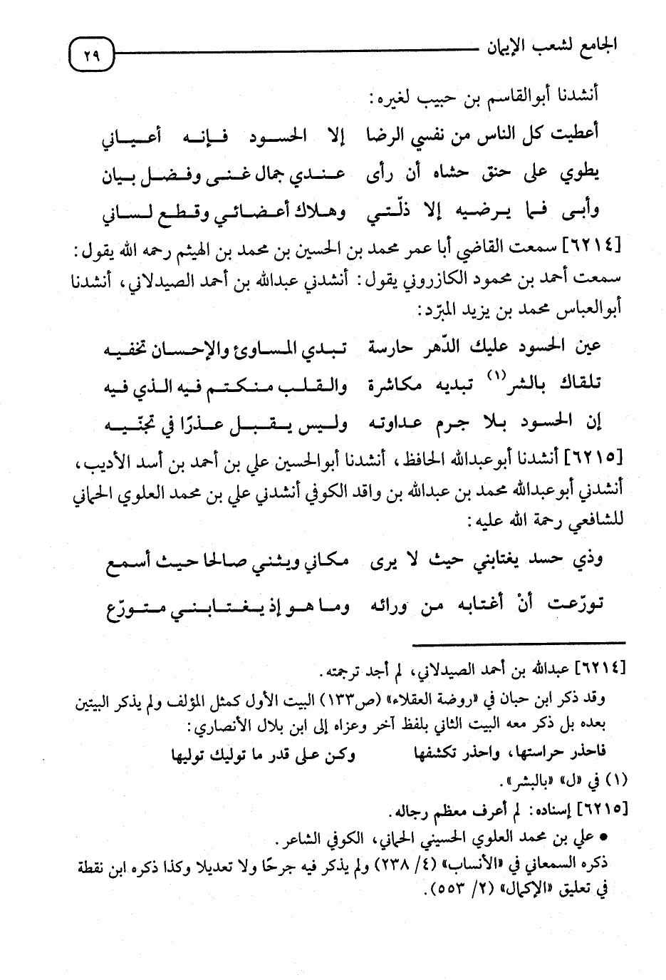 6215 - أَنْشَدَنَا أَبُو عَبْدِ اللهِ الْحَافِظُ، أَنْشَدَنَا أَبُو الْحُسَيْنِ عَلِيُّ بْنُ أَحْمَدَ بْنِ أَسَدٍ الْأَدِيبُ، أَنْشِدْنِي أَبُو عَبْدِ اللهِ مُحَمَّدُ بْنُ عَبْدِ اللهِ بْنِ وَاقِدٍ الْكُوفِيُّ، أَنْشِدْنِي عَلِيُّ بْنُ مُحَمَّدٍ الْعَلَوِيُّ الْجَمَّالُ الشَّافِعِيُّ رَحِمَهُ اللهُ:"