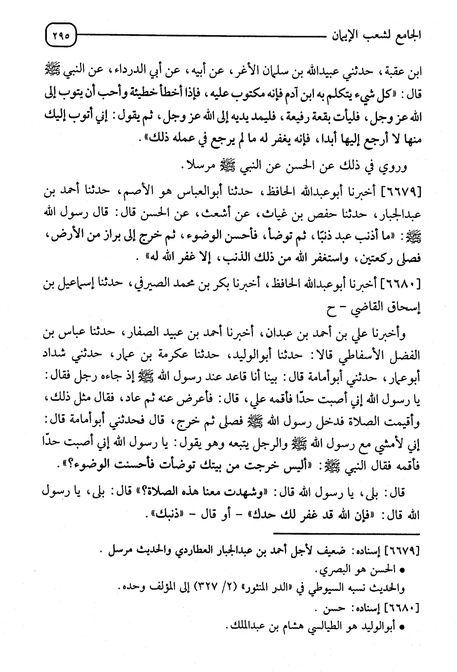6680 - أَخْبَرَنَا أَبُو عَبْدِ اللهِ الْحَافِظُ، أَنَا أَبُو بَكْرِ بْنُ مُحَمَّدٍ الصَّيْرَفِيُّ، نا إِسْمَاعِيلُ بْنُ إِسْحَاقَ الْقَاضِي، ح، وَأَخْبَرَنَا عَلِيُّ بْنُ أَحْمَدَ بْنِ عَبْدَانَ، أَنَا أَحْمَدُ بْنُ عُبَيْدٍ الصَّفَّارُ، نا عَبَّاسُ بْنُ الْفَضْلِ الْأَسْفَاطِيُّ، نا أَبُو الْوَلِيدِ، نا عِكْرِمَةُ بْنُ عَمَّارٍ، حَدَّثَنِي شَدَّادُ أَبُو عَمَّارٍ، حَدَّثَنِي أَبُو أُمَامَةَ، قَالَ: بَيْنَا أَنَا قَاعِدٌ عِنْدَ رَسُولِ اللهِ صَلَّى اللَّهُ عَلَيْهِ وَسَلَّمَ إِذْ جَاءَهُ رَجُلٌ، فَقَالَ: يَا رَسُولَ اللهِ إِنِّي أَصَبْتُ حَدًّا فَأَقِمْهُ عَلَيَّ، قَالَ: فَأَعْرَضَ عَنْهُ، ثُمَّ عَادَ وَقَالَ مِثْلَ ذَلِكَ، وَأُقِيمَتِ الصَّلَاةُ، فَدَخَلَ رَسُولُ اللهِ صَلَّى اللَّهُ عَلَيْهِ وَسَلَّمَ فَصَلَّى ثُمَّ خَرَجَ، قَالَ: فَحَدَّثَنِي أَبُو أُمَامَةَ، قَالَ: إِنِّي لَأَمْشِي مَعَ رَسُولِ اللهِ صَلَّى اللَّهُ عَلَيْهِ وَسَلَّمَ وَالرَّجُلُ يَتْبَعُهُ، وَهُوَ يَقُولُ: يَا رَسُولَ اللهِ، أَصَبْتُ حَدًّا فَأَقِمْهُ، فَقَالَ النَّبِيُّ صَلَّى اللَّهُ عَلَيْهِ وَسَلَّمَ: " §أَلَيْسَ خَرَجْتَ مِنْ بَيْتِكَ تَوَضَّأْتَ فَأَحْسَنْتَ الْوضُوءَ؟ "، قَالَ: بَلَى يَا رَسُولَ اللهِ، قَالَ: " وَشَهِدْتَ مَعَنَا هَذِهِ الصَّلَاةَ؟ "، قَالَ: بَلَى يَا رَسُولَ اللهِ، قَالَ: " فَإِنَّ اللهَ غَفَرَ لَكَ حَدَّكَ "، أَوْ قَالَ: " ذَنْبَكَ " -[296]- لَفْظُ حَدِيثِ ابْنِ عَبْدَانَ، أَخْرَجَهُ مُسْلِمٌ فِي الصَّحِيحِ، مِنْ وَجْهٍ آخَرَ، عَنْ عِكْرِمَةَ بْنِ عَمَّارٍ