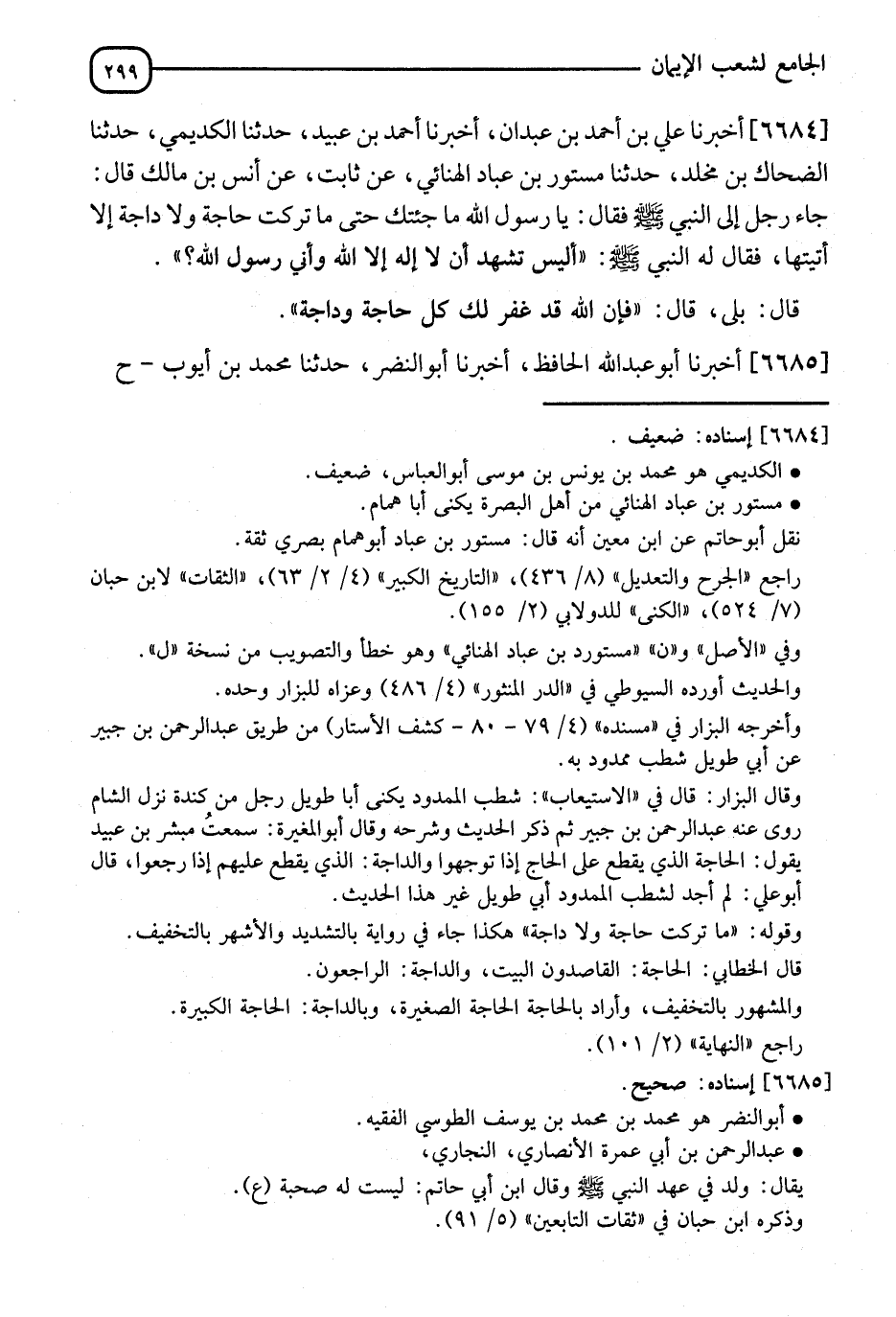 6684 - أَخْبَرَنَا عَلِيُّ بْنُ أَحْمَدَ بْنِ عَبْدَانَ، أَنَا أَحْمَدُ بْنُ عُبَيْدٍ، نا الْكُدَيْمِيُّ، نا الضَّحَّاكُ بْنُ مَخْلَدٍ، نا مَسْتُورُ بْنُ عَبَّادٍ الْهُنَائِيُّ، عَنْ ثَابِتٍ، عَنْ أَنَسِ بْنِ مَالِكٍ، قَالَ: جَاءَ رَجُلٌ إِلَى النَّبِيِّ صَلَّى اللَّهُ عَلَيْهِ وَسَلَّمَ، فَقَالَ: يَا رَسُولَ اللهِ، مَا جِئْتُكَ حَتَّى مَا تَرَكْتُ حَاجَةً، وَلَا دَاجَةً إِلَّا أَتَيْتُهَا، فَقَالَ النَّبِيُّ صَلَّى اللَّهُ عَلَيْهِ وَسَلَّمَ: " §أَلَيْسَ تَشْهَدُ أَنْ لَا إِلَهَ إِلَّا اللهُ، وَأَنِّي رَسُولُ اللهِ؟ "، قَالَ: بَلَى، قَالَ: " فَإِنَّ اللهَ قَدْ غَفَرَ لَكَ كُلَّ حَاجَةٍ وَدَاجَةٍ "