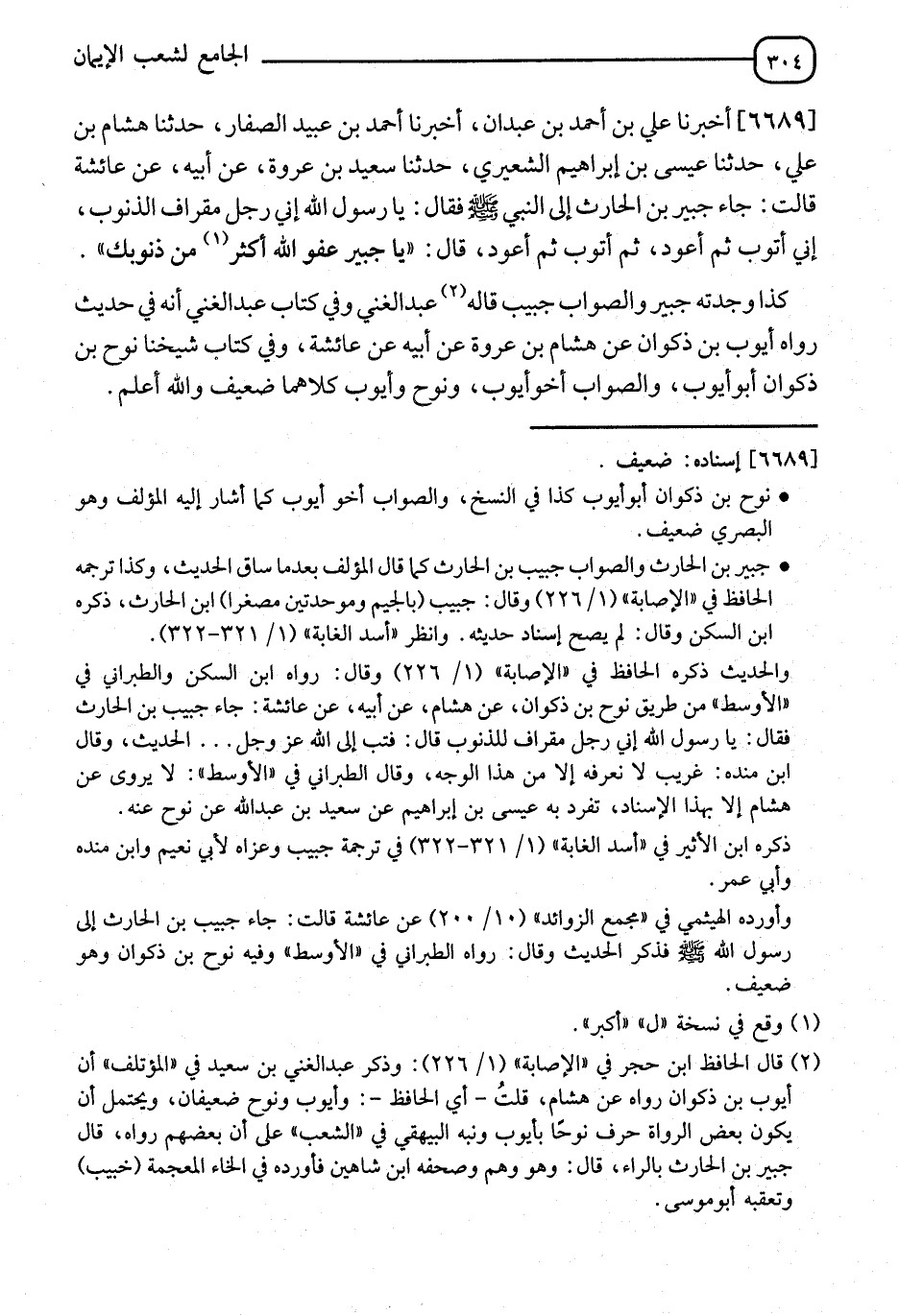 6689 - أَخْبَرَنَا عَلِيُّ بْنُ أَحْمَدَ بْنِ عَبْدَانَ، أَنَا أَحْمَدُ بْنُ عُبَيْدٍ الصَّفَّارُ، نا هِشَامُ بْنُ عَلِيٍّ، نا عِيسَى بْنُ إِبْرَاهِيمَ الشَّعِيرِيُّ، نا سَعِيدُ بْنُ عَبْدِ اللهِ، نا نُوحُ بْنُ ذَكْوَانَ أَبُو أَيُّوبَ، عَنْ هِشَامِ بْنِ عُرْوَةَ، عَنْ أَبِيهِ، عَنْ عَائِشَةَ، قَالَتْ: جَاءَ جُبَيْرُ بْنُ الْحَارِثِ إِلَى رَسُولِ اللهِ صَلَّى اللَّهُ عَلَيْهِ وَسَلَّمَ، فَقَالَ: يَا رَسُولَ اللهِ، إِنِّي رَجُلٌ مِقْرَافُ الذُّنُوبِ، إِنِّي أَتُوبُ ثُمَّ أَعُودُ، ثُمَّ أَتُوبُ ثُمَّ أَعُودُ؟، قَالَ: " يَا جُبَيْرُ §عَفْوُ اللهِ أَكْثَرُ مِنْ ذُنُوبِكَ " كَذَا " وَجَدْتُهُ جُبَيْرٌ، وَالصَّوَابُ حَبِيبٌ، قَالَهُ عَبْدُ الْغَنِيِّ، وَفِي رِوَايَةِ عَبْدِ الْغَنِيِّ أَنَّهُ فِي حَدِيثٍ رَوَاهُ أَيُّوبُ بْنُ ذَكْوَانَ، عَنْ هِشَامِ بْنِ عُرْوَةَ، عَنْ أَبِيهِ، عَنْ عَائِشَةَ، وَفِي كِتَابِ شَيْخِنَا نُوحِ بْنِ ذَكْوَانَ: أَبُو أَيُّوبَ، وَالصَّوَابُ: أَخُو أَيُّوبَ، وَنُوحٌ، وَكِلَاهُمَا ضَعِيفٌ، وَاللهُ أَعْلَمُ "