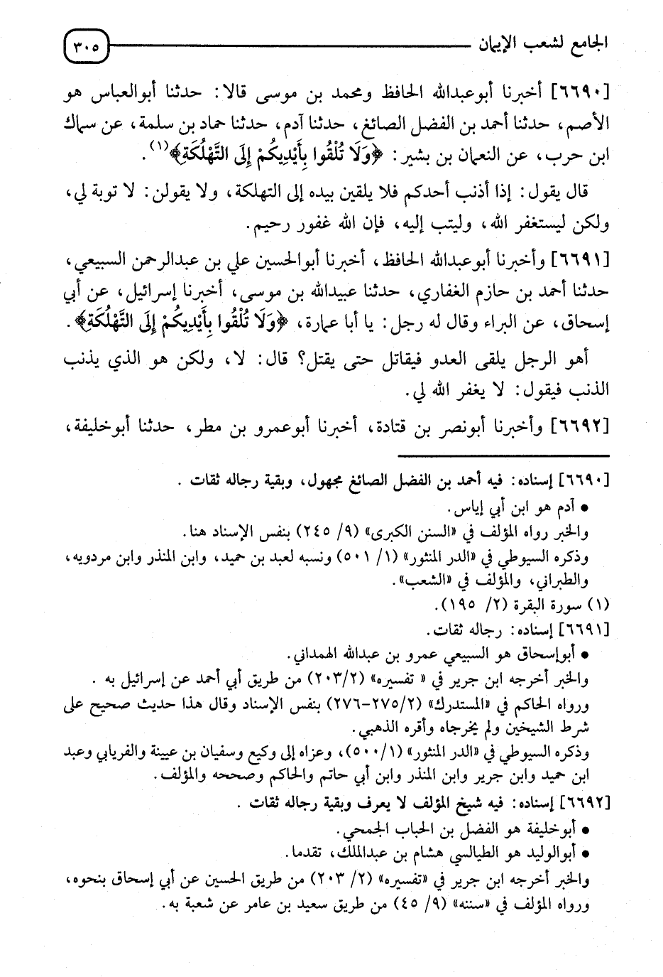 6690 - أَخْبَرَنَا أَبُو عَبْدِ اللهِ الْحَافِظُ، وَمُحَمَّدُ بْنُ مُوسَى، قَالَا: نا أَبُو الْعَبَّاسِ هُوَ الْأَصَمُّ، نا أَحْمَدُ بْنُ الْفَضْلِ الصَّائِغُ، نا آدَمُ، نا حَمَّادُ بْنُ سَلَمَةَ، عَنِ السَّمَّاكِ بْنِ حَرْبٍ، عنِ النُّعْمَانِ بْنِ بَشِيرٍ: {§وَلَا تُلْقُوا بِأَيْدِيكُمْ إِلَى التَّهْلُكَةِ} [البقرة: 195]، قَالَ: يَقُولُ: " إِذَا أَذْنَبَ أَحَدُكُمْ فَلَا يُلْقِيَنَّ بِيَدِهِ إِلَى التَّهْلُكَةِ، وَلَا يَقُولُنَّ: لَا تَوْبَةَ لِي، وَلَكِنْ لِيَسْتَغْفِرَ اللهَ وَلْيَتُبْ إِلَيْهِ، فَإِنَّ اللهَ غَفُورٌ رَحِيمٌ "