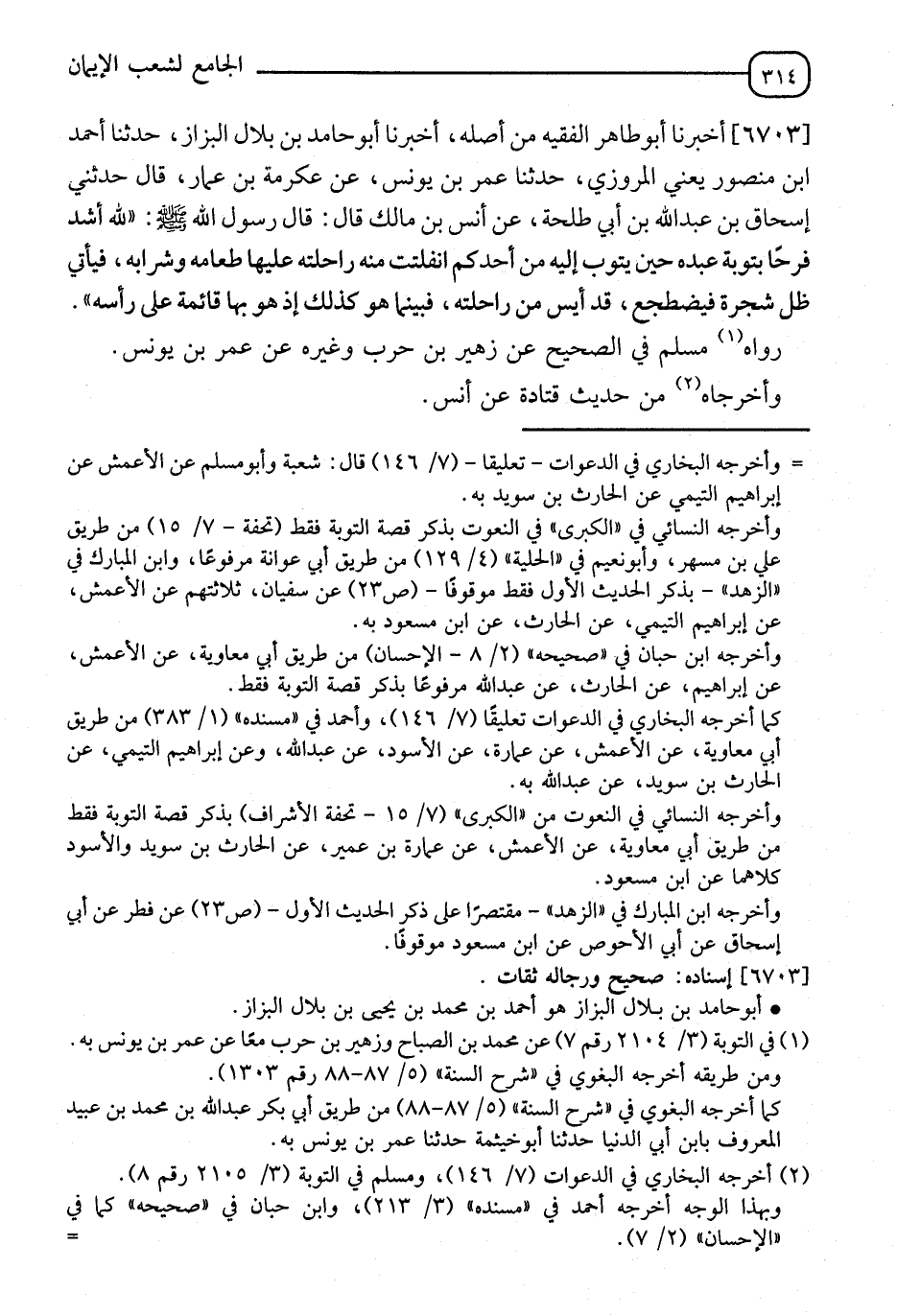 6703 - أَخْبَرَنَا أَبُو طَاهِرٍ الْفَقِيهُ، مِنْ أَصْلِهِ، أَنَا أَبُو حَامِدِ بْنُ بِلَالٍ الْبَزَّارُ، نا أَحْمَدُ بْنُ مَنْصُورٍ يَعْنِي الْمَرْوَزِيَّ، نا عُمَرُ بْنُ يُونُسَ، عَنْ عِكْرِمَةَ بْنِ عَمَّارٍ، قَالَ: حَدَّثَنِي إِسْحَاقُ بْنُ عَبْدِ اللهِ بْنِ أَبِي طَلْحَةَ، عَنْ أَنَسِ بْنِ مَالِكٍ، قَالَ: قَالَ رَسُولُ اللهِ صَلَّى اللَّهُ عَلَيْهِ وَسَلَّمَ: §" لَلَّهُ أَشَدُّ فَرَحًا بِتَوْبَةِ عَبْدِهِ حِينَ يَتُوبُ إِلَيْهِ مِنْ أَحَدِكُمْ تَنْفَلِتُ عَنْهُ رَاحِلَتُهُ عَلَيْهَا طَعَامُهُ وَشَرَابُهُ، وَأَتَى ظِلَّ شَجَرَةٍ لِيَضْطَجِعَ، قَدْ أَيسَ مِنْ رَاحِلَتِهِ، فَبَيْنَمَا هُوَ كَذَلِكَ إِذْ هُوَ بِهَا قَائِمَةٌ عَلَى رَأْسِهِ " رَوَاهُ مُسْلِمٌ فِي الصَّحِيحِ، عَنْ زُهَيْرِ بْنِ حَرْبٍ، وَغَيْرُهُ، عَنْ عُمَرَ بْنِ يُونُسَ، وَأَخْرَجَاهُ مِنْ حَدِيثِ قَتَادَةَ، عَنْ أَنَسٍ -[315]- حَدِيثُ الْغَارِ فِي بَنِي إِسْرَائِيلَ