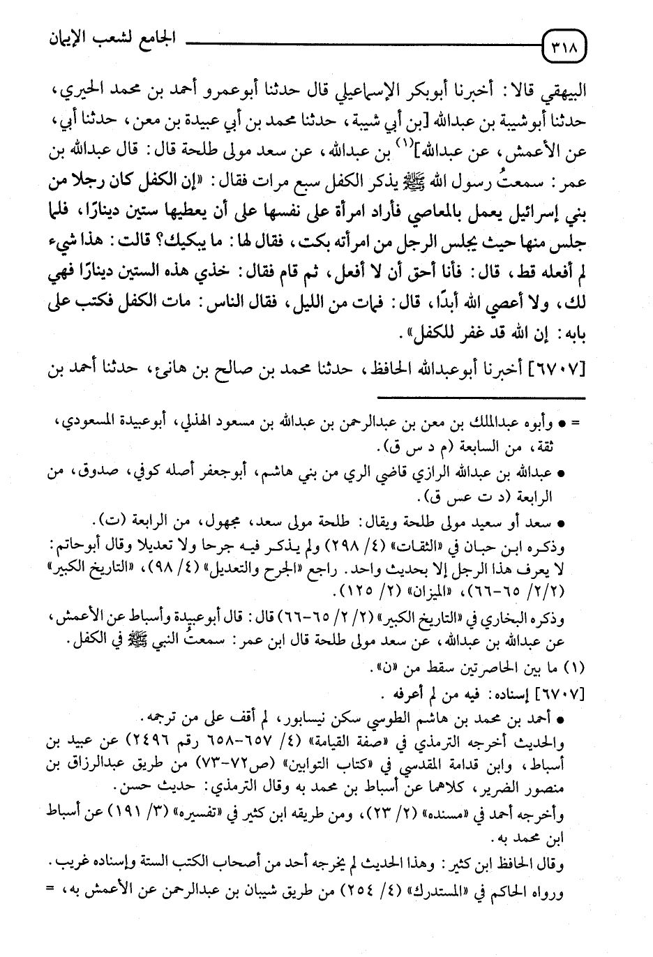 6707 - أَخْبَرَنَا أَبُو عَبْدِ اللهِ الْحَافِظُ، نا مُحَمَّدُ بْنُ صَالِحِ بْنِ هَانِئٍ، نا أَحْمَدُ بْنُ -[319]- مُحَمَّدِ بْنِ هَاشِمٍ الطُّوسِيُّ، سَاكِنُ نَيْسَابُورَ، نا إِسْحَاقُ بْنُ إِبْرَاهِيمَ الْحَنْظَلِيُّ، نا أَسْبَاطُ بْنُ مُحَمَّدٍ الْقُرَشِيُّ، عَنِ الْأَعْمَشِ، عَنْ عَبْدِ اللهِ بْنِ عَبْدِ اللهِ، عَنْ سَعْدٍ، مَوْلَى طَلْحَةَ، عَنْ عَبْدِ اللهِ بْنِ عُمَرَ، قَالَ: سَمِعْتُ رَسُولَ اللهِ صَلَّى اللَّهُ عَلَيْهِ وَسَلَّمَ يُحَدِّثُ حَدِيثًا لَوْ لَمْ أَسْمَعْهُ إِلَّا مَرَّةً أَوْ مَرَّتَيْنِ حَتَّى عَدَّ سَبْعَ مَرَّاتٍ، وَلَكِنِّي سَمِعْتُهُ أَكْثَرَ مِنْ ذَلِكَ، قَالَ: " كَانَ §الْكِفْلُ مِنْ بَنِي إِسْرَائِيلَ لَا يَتَوَرَّعُ مِنْ ذَنْبٍ عَمِلَهُ، فَأَتَتْهُ امْرَأَةٌ فَأَعْطَاهَا سِتِّينَ دِينَارًا عَلَى أَنْ يَطَأَهَا، فَلَمَّا قَعَدَ مِنْهَا مَقْعَدَ الرَّجُلِ مِنَ امْرَأَتِهِ أَرْعَدَتْ وَبَكَتْ، فَقَالَ: مَا يُبْكِيكِ أَكْرَهْتُكِ؟ قَالَتْ: لَا، وَلَكِنْ هَذَا عَمَلٌ مَا عَمِلْتُهُ قَطُّ، وَإِنَّمَا حَمَلَنِي عَلَيْهِ الْحَاجَةُ، قَالَ: فَتَعْمَلِي هَذَا وَلَمْ تَفْعَلِيهِ قَطُّ، فَاذْهَبِي فَهُوَ لَكِ، ثُمَّ قَالَ: وَاللهِ لَا أَعْصِي اللهَ أَبَدًا، فَمَاتَ مِنْ لَيْلَتِهِ فَأَصْبَحَ مَكْتُوبٌ عَلَى بَابِهِ: قَدْ غَفَرَ اللهُ لِلْكِفْلِ " قَالَ أَبُو عِيسَى: وَقَدْ رَوَى شَيْبَانُ وَغَيْرُ وَاحِدٍ، عَنِ الْأَعْمَشِ نَحْوَ هَذَا، وَرَوَى بَعْضُهُمْ، عَنِ الْأَعْمَشِ فَلَمْ يَرْفَعْهُ، وَرَوَى أَبُو بَكْرِ بْنُ عَيَّاشٍ هَذَا الْحَدِيثَ عَنِ الْأَعْمَشِ فَأَخْطَأَ فِيهِ، وَقَالَ: عَنْ عَبْدِ اللهِ بْنِ عَبْدِ اللهِ، عَنْ سَعِيدِ بْنِ جُبَيْرٍ، عَنِ ابْنِ عُمَرَ، وَهُوَ غَيْرُ مَحْفُوظٍ