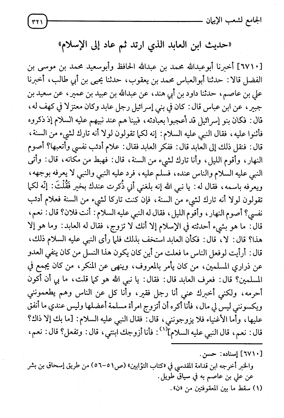 6710 - أَخْبَرَنَا أَبُو عَبْدِ اللهِ مُحَمَّدُ بْنُ عَبْدِ اللهِ الْحَافِظُ، وَأَبُو سَعِيدٍ مُحَمَّدُ بْنُ مُوسَى بْنِ الْفَضْلِ، قَالَا: نا أَبُو الْعَبَّاسِ مُحَمَّدُ بْنُ يَعْقُوبَ، نا يَحْيَى بْنُ أَبِي طَالِبٍ، أَنَا عَلِيُّ بْنُ عَاصِمٍ، نا دَاوُدُ بْنُ أَبِي هِنْدٍ، عَنْ عَبْدِ اللهِ بْنِ عُبَيْدِ بْنِ عُمَيْرٍ، عَنْ سَعِيدِ بْنِ جُبَيْرٍ، عَنِ ابْنِ عَبَّاسٍ، قَالَ: " كَانَ فِي بَنِي إِسْرَائِيلَ رَجُلٌ عَابِدٌ، وَكَانَ مُعْتَزِلًا فِي كَهْفٍ لَهُ، قَالَ: وَكَانَ بَنُو إِسْرَائِيلَ، قَدْ أُعْجِبُوا بِعِبَادَتِهِ، فَبَيْنَمَا هُمْ عِنْدَ نَبِيِّهِمْ عَلَيْهِ السَّلَامُ إِذْ ذَكَرُوهُ، فَآمَنُوا عَلَيْهِ، فَقَالَ النَّبِيُّ صَلَّى اللَّهُ عَلَيْهِ وَسَلَّمَ: إِنَّهُ §لَكَمَا تَقُولُونَ، لَوْلَا أَنَّهُ تَارِكٌ لِشَيْءٍ مِنَ السُّنَّةِ، قَالَ: لِنَقُلْ ذَلِكَ إِلَى الْعَابِدِ، قَالَ: فَفَكَّرَ الْعَابِدُ، فَقَالَ: عَلَامَ أُذِيبُ نَفْسِي وَأَنْصِبُهَا، أَصُومُ النَّهَارَ، وَأَقْوَمُ اللَّيْلَ، وَأَنَا تَارِكٌ لِشَيْءٍ مِنَ السُّنَّةِ، قَالَ: فَهَبَطَ مِنْ مَكَانِهِ، قَالَ: وَأَتَى النَّبِيَّ صَلَّى اللَّهُ عَلَيْهِ وَسَلَّمَ وَالنَّاسُ عِنْدَهُ، فَسَلَّمَ عَلَيْهِ وَرَدَّ عَلَيْهِ النَّبِيُّ، وَالنَّبِيُّ لَا يَعْرِفُهُ بِوَجْهِهِ وَيَعْرِفُهُ بِاسْمِهِ، قَالَ: يَا نَبِيَّ اللهِ، إِنَّهُ بَلَغَنِي أَنِّي ذُكِرْتُ عِنْدَكَ بِخَيْرٍ، فَقُلْتَ: إِنَّهُ لَكَمَا تَقُولُونَ لَوْلَا أَنَّهُ تَارِكٌ لِشَيْءٍ مِنَ السُّنَّةِ، فَإِنْ كُنْتُ تَارِكًا فَعَلَامَ أُذِيبُ نَفْسِي، أَصُومُ النَّهَارَ وَأَقْوَمُ اللَّيْلَ؟، قَالَ النَّبِيُّ صَلَّى اللَّهُ عَلَيْهِ وَسَلَّمَ: " أَنْتَ فُلَانٌ؟ "، قَالَ: نَعَمْ، قَالَ: مَا هُوَ بِشَيْءٍ أَحْدَثْتَهُ فِي الْإِسْلَامِ إِلَّا لَكَ لَا تَرَوَّحُ، قَالَ لَهُ الْعَابِدُ: وَمَا هُوَ هَذَا؟، قَالَ: لَا، وَكَانَ الْعَابِدُ اسْتَخَفَّ بِذَلِكَ، فَلَمَّا رَأَى النَّبِيُّ صَلَّى اللَّهُ عَلَيْهِ وَسَلَّمَ ذَلِكَ، قَالَ: أَرَأَيْتَ لَوْ فَعَلَ النَّاسُ مَا فَعَلْتَ، مِنْ أَيْنَ كَانَ يَكُونُ هَذَا النَّسْلُ؟ مَنْ كَانَ يَتَّقِي الْعَدُوَّ عَنْ ذَرَارِي الْمُسْلِمٌينَ؟ مَنْ كَانَ يَأْمُرُ بِالْمَعْرُوفِ وَيَنْهَى عَنِ الْمُنْكَرِ؟، وَمَنْ كَانَ يَجْمَعُ فِي الْمُسْلِمِينَ؟، قَالَ: فَعَرَفَ الْعَابِدُ، قَالَ: فَقَالَ: يَا نَبِيَّ اللهِ، هُوَ كَمَا قُلْتَ، بِأَبِي أَنْ أَكُونَ أُحَرِّمُهُ، وَلَكِنِّي أُخْبِرُكَ عَنِّي، أَنَا رَجُلٌ فَقِيرٌ، وَأَنَا كَلٌّ عَلَى النَّاسِ، وَهُمْ يُطْعِمُونَنِي وَيَكْسُونَنِي، لَيْسَ لِي مَالٌ، فَأَنَا أَكْرَهُ أَنْ أَتَزَوَّجَ امْرَأَةً مُسْلِمَةً أَعْضِلُهَا، وَلَيْسَ عِنْدِي مَا أُنْفِقُ عَلَيْهَا، وَأَمَّا الْأَغْنِيَاءُ فَلَا يُزَوِّجُونَنِي، قَالَ: فَقَالَ النَّبِيُّ صَلَّى اللَّهُ عَلَيْهِ وَسَلَّمَ: مَا بِكَ إِلَّا ذَاكَ؟، قَالَ: نَعَمْ، قَالَ النَّبِيُّ صَلَّى اللَّهُ عَلَيْهِ وَسَلَّمَ: فَأَنَا أُزَوِّجُكَ ابْنَتِي، قَالَ: وَتَفْعَلُ؟، قَالَ: نَعَمْ، -[322]- قَالَ: قَدْ قَبِلْتُ، فَزَوَّجَهُ ابْنَتَهُ، قَالَ: فَدَخَلَ بِهَا فَوَلَدَتْ لَهُ غُلَامًا، قَالَ ابْنُ عَبَّاسٍ: فَوَاللهِ مَا وُلِدَ فِي بَنِي إِسْرَائِيلَ مَوْلُودٌ، وَكَانُوا أَشَدَّ فَرَحًا بِهِ مِنْهُمْ بِذَلِكَ الْغُلَامِ، قَالُوا: ابْنُ عَابِدٍ مِنَّا، وَابْنُ نَبِيِّنَا، إِنَّا نَرْجُو أَنْ يَبْلُغَ اللهُ بِهِ مَا بَلَغَ بِرَجُلٍ مِنَّا، قَالَ: فَلَمَّا بَلَغَ الْغُلَامُ انْقَطَعَ إِلَى عِبَادَةِ الْأَوْثَانِ، قَالَ: فَتَبِعَتْهُ فِئَامٌ مِنْهُمْ كَثِيرٌ، قَالَ: فَلَمَّا رَأَى كَثْرَتَهُمْ، قَالَ لَهُمْ: إِنِّي أَرَاكُمْ كَثِيرًا، وَإ
