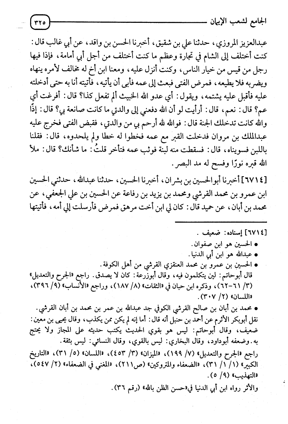 6714 - أَخْبَرَنَا أَبُو الْحُسَيْنِ بْنُ بِشْرَانَ، أَنَا الْحُسَيْنُ، نا عَبْدُ اللهِ، حَدَّثَنِي الْحُسَيْنُ بْنُ عَمْرِو بْنِ مُحَمَّدٍ الْقُرَشِيُّ، وَمُحَمَّدُ بْنُ يَزِيدَ بْنِ رِفَاعَةَ، عَنِ الْحُسَيْنِ بْنِ عَلِيٍّ الْجُعْفِيِّ، عَنْ مُحَمَّدِ بْنِ أَبَانَ، عَنْ حُمَيْدٍ، قَالَ: " كَانَ لِي ابْنُ أُخْتٍ مُرْهِقٌ فَمَرِضَ فَأَرْسَلْتُ إِلَى أُمِّهِ فَأَتَيْتُهَا، -[326]- فَإِذَا هِيَ عِنْدَ رَأْسِهِ تَبْكِي، فَقَالَ: يَا خَالِ مَا يُبْكِيهَا؟، قَالَ: مَا تَعْلَمُ مِنْكَ، قَالَ: أَلَيْسَ إِنَّمَا تَرْحَمُنِي؟، قُلْتُ: بَلَى، قَالَ: فَإِنَّ §اللهَ أَرْحَمُ بِي مِنْهَا، فَلَمَّا مَاتَ أُنْزِلْتُ الْقَبْرَ مَعَ غَيْرِي، فَذَهَبْتُ أُسَوِّي لَبِنَهُ، فَاطَّلَعْتُ فِي اللَّحْدِ فَإِذَا هُوَ مُدُّ بَصَرِي، فَقُلْتُ لِصَاحِبِي: رَأَيْتَ مَا رَأَيْتُ؟، قَالَ: نَعَمْ، فَلْيَهْنِكَ ذَاكَ، قَالَ: فَظَنَنْتُ أَنَّهُ بِالْكَلِمَةِ الَّتِي قَالَهَا "