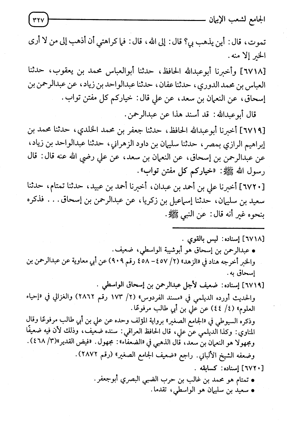 6719 - أَخْبَرَنَا أَبُو عَبْدِ اللهِ الْحَافِظُ، نا جَعْفَرُ بْنُ مُحَمَّدٍ الْخَلَدِيُّ، نا مُحَمَّدُ بْنُ إِبْرَاهِيمَ الرَّازِيُّ بِمِصْرَ، نا سُلَيْمَانُ بْنُ دَاوُدَ الزَّعْفَرَانِيُّ، نا عَبْدُ الْوَاحِدِ بْنُ زِيَادٍ، عَنْ عَبْدِ الرَّحْمَنِ بْنِ إِسْحَاقَ، عَنِ النُّعْمَانِ بْنِ سَعْدٍ، عَنْ عَلِيٍّ، رَضِيَ اللهُ عَنْهُ قَالَ: قَالَ رَسُولُ اللهِ صَلَّى اللَّهُ عَلَيْهِ وَسَلَّمَ: §" خِيَارُكُمْ كُلُّ مُفْتَنٍ تَوَّابٌ ".
