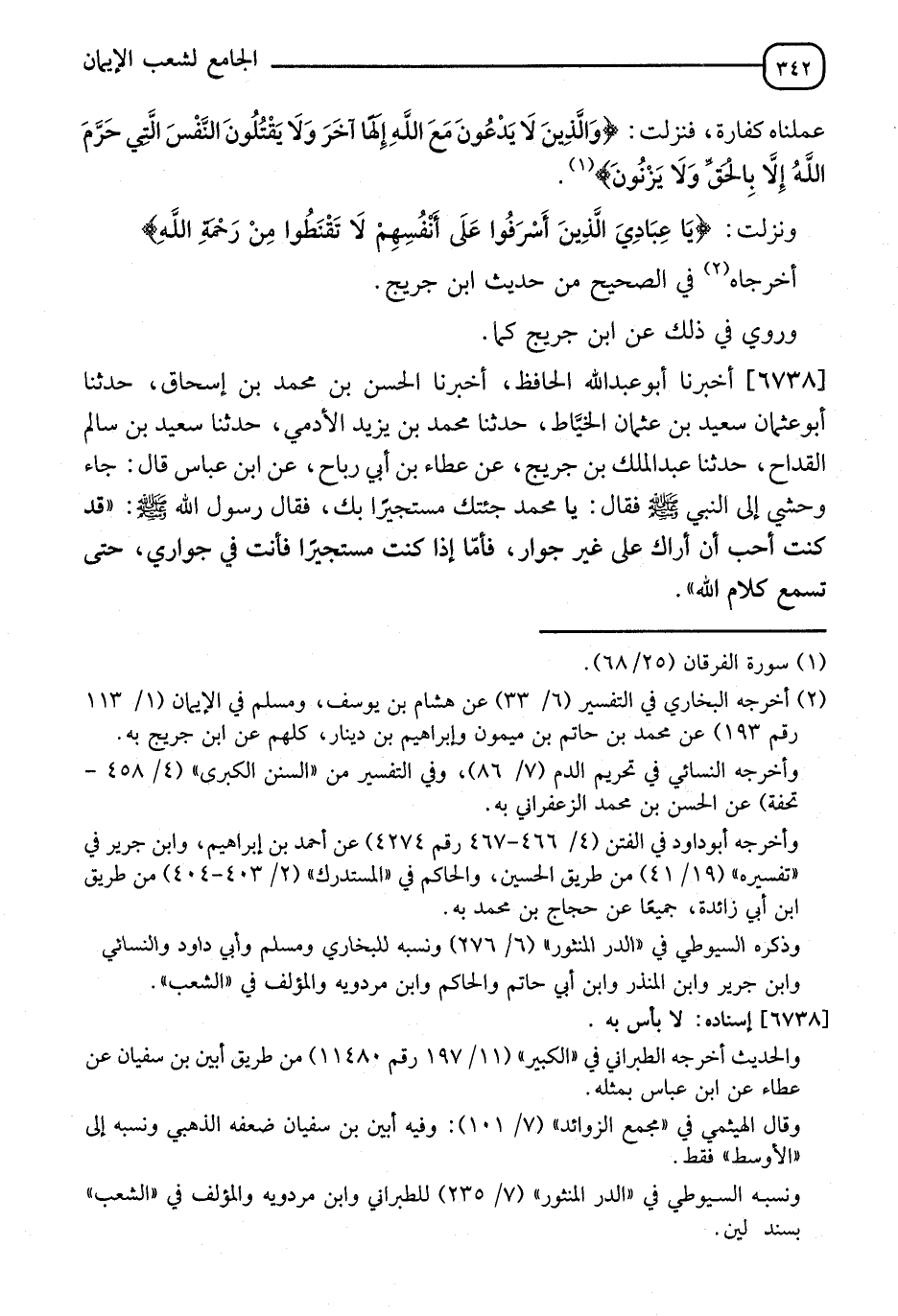 6738 - أَخْبَرَنَا أَبُو عَبْدِ اللهِ الْحَافِظُ، نا الْحَسَنُ بْنُ مُحَمَّدِ بْنِ إِسْحَاقَ، نا أَبُو عُثْمَانَ سَعِيدُ بْنُ عُثْمَانَ الْخَيَّاطُ، نا مُحَمَّدُ بْنُ يَزِيدَ الْأَدَمِيُّ، نا سَعِيدُ بْنُ سَالِمٍ الْقِدَاحُ، نا عَبْدُ الْمَلِكِ بْنُ جُرَيْجٍ، عَنْ عَطَاءِ بْنِ أَبِي رَبَاحٍ، عَنِ ابْنِ عَبَّاسٍ قَالَ: جَاءَ وَحْشِيٌّ إِلَى النَّبِيِّ صَلَّى اللَّهُ عَلَيْهِ وَسَلَّمَ، فَقَالَ: يَا مُحَمَّدُ جِئْتُكَ مُسْتَجِيرًا بِكَ، فَقَالَ رَسُولُ اللهِ صَلَّى اللَّهُ عَلَيْهِ وَسَلَّمَ: " قَدْ كُنْتُ أُحِبُّ أَنْ أَرَاكَ عَلَى غَيْرِ جِوَارٍ، فَأَمَا §إِذَا كُنْتُ مُسْتَجِيرًا فَأَنْتَ فِي جَوَارِي حَتَّى تَسْمَعَ كَلَامَ اللهِ تَعَالَى "، -[343]- قَالَ: فَإِنِّي أَشْرَكْتَ بِاللهِ الْعَظِيمِ، وَقَتَلْتُ النَّفْسَ الَّتِي حَرَّمَ اللهُ، فَهَلْ تُقْبَلُ مِنْ مِثْلِي تَوْبَةٌ؟، فَصَمَتَ رَسُولُ اللهِ صَلَّى اللَّهُ عَلَيْهِ وَسَلَّمَ فَلَمْ يُجِبْهُ حَتَّى نَزَلَ عَلَيْهِ الْقُرْآنُ: {وَالَّذِينَ لَا يَدْعُونَ مَعَ اللهِ إِلَهًا آخَرَ وَلَا يَقْتُلُونَ النَّفْسَ الَّتِي حَرَّمَ اللهُ إِلَّا بِالْحَقِّ} [الفرقان: 68] إِلَى قَوْلِهِ {يُبَدِّلُ اللهُ سَيِّئَاتِهِمْ حَسَنَاتٍ} [الفرقان: 70] الْآيَةَ، فَقَرَأَهَا عَلَيْهِ، فَقَالَ: أَرَى شَرْطًا، فَلَعَلِّي لَا أَعْمَلُ صَالِحًا، أَنَا فِي جِوَارِكَ حَتَّى أَسْمَعَ كَلَامَ اللهِ، فَنَزَلَتْ {إِنَّ اللهَ لَا يَغْفِرُ أَنْ يُشْرَكَ بِهِ وَيَغْفِرُ مَا دُونَ ذَلِكَ لِمَنْ يَشَاءُ} [النساء: 48] فَدَعَاهُ فَقَرَأَهَا عَلَيْهِ، فَقَالَ وَحْشِيٌّ: فَلَعَلِّي مِمَّنْ لَا يَشَاءُ اللهُ، أَنَا فِي جِوَارِكَ حَتَّى أَسْمَعَ كَلَامَ اللهِ قَالَ: فَنَزَلَتْ {يَا عِبَادِيَ الَّذِينَ أَسْرَفُوا عَلَى أَنْفُسِهِمْ لَا تَقْنَطُوا مِنْ رَحْمَةِ اللهِ} [الزمر: 53] الْآيَةَ قَالَ وَحْشِيٌّ: الْآنَ لَا أَرَى شَرْطًا، فَتَشَهَّدَ وَأَسْلَمَ