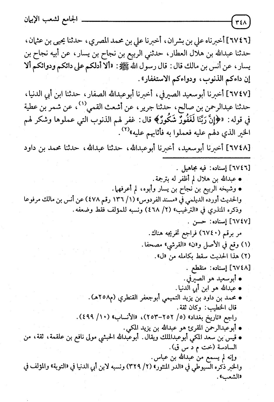 6746 - أَخْبَرَنَاهُ عَلِيُّ بْنُ بِشْرَانَ، أَنَا عَلِيُّ بْنُ مُحَمَّدٍ الْمِصْرِيُّ، نا يَحْيَى بْنُ عُثْمَانَ، نا عَبْدُ اللهِ بْنُ هِلَالٍ الْعَطَّارُ، حَدَّثَنِي الرَّبِيعُ بْنُ نَجَاحِ بْنِ يَسَارٍ، عَنْ أَبِيهِ نَجَاحِ بْنِ يَسَارٍ، عَنْ أَنَسِ بْنِ مَالِكٍ قَالَ: قَالَ رَسُولُ اللهِ صَلَّى اللَّهُ عَلَيْهِ وَسَلَّمَ: " §أَلَا أَدُلُّكُمْ عَلَى دَائِكُمْ وَدَوَائِكُمْ، أَلَا إِنَّ دَاءَكُمُ الذُّنُوبُ، وَدَوَاؤُكُمُ الِاسْتِغْفَارُ "