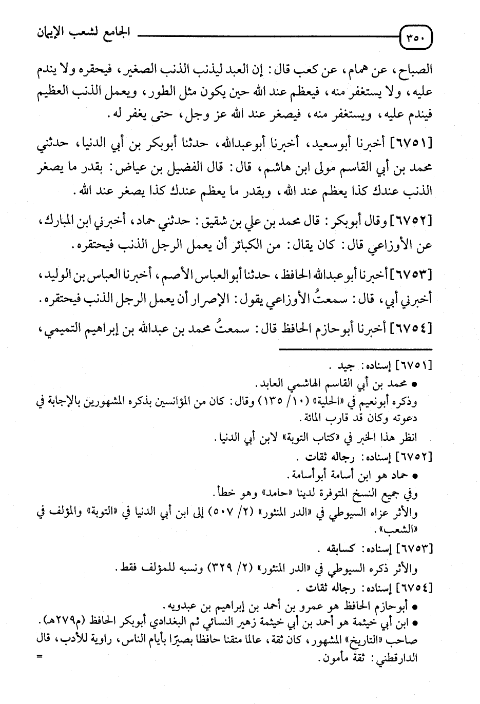 6753 - أَخْبَرَنَا أَبُو عَبْدِ اللهِ الْحَافِظُ، نا أَبُو الْعَبَّاسِ الْأَصَمُّ، أَنَا الْعَبَّاسُ بْنُ الْوَلِيدِ، أَخْبَرَنِي أَبِي، قَالَ: سَمِعْتُ الْأَوْزَاعِيَّ، يَقُولُ: §" الْإِصْرَارُ أَنْ يَعْمَلَ الرَّجُلُ الذَّنْبَ فَيَحْتَقِرُهُ "