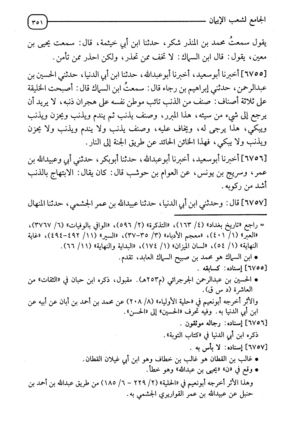 6755 - أَخْبَرَنَا أَبُو سَعِيدٍ، أَنَا أَبُو عَبْدِ اللهِ، نا ابْنُ أَبِي الدُّنْيَا، حَدَّثَنِي الْحُسَيْنُ بْنُ عَبْدِ الرَّحْمَنِ، حَدَّثَنِي إِبْرَاهِيمُ بْنُ رَجَاءٍ، سَمِعْتُ ابْنَ السَّمَّاكِ قَالَ: " §أَصْبَحَتِ الْخَلِيقَةُ عَلَى ثَلَاثَةِ أَصْنَافٍ: صِنْفٌ مِنَ الذَّنْبِ تَائِبٌ، مُوَطِّنٌ لِنَفْسِهِ عَلَى هِجْرَانِ ذَنْبِهِ لَا يُرِيدُ أَنْ يُرْجِعَ إِلَى شَيْءٍ مِنْ سَيِّئَتِهِ هَذَا الْمُبَرِّزُ، وَصِنْفٌ يُذْنِبُ ثُمَّ يَنْدَمُ، وَيُذْنِبُ وَيَحْزَنُ، وَيُذْنِبُ وَيَبْكِي، هَذَا يُرْجَى لَهُ وَيُخَافُ عَلَيْهِ، وَصِنْفٌ يُذْنِبُ وَلَا يَنْدَمُ، وَيُذْنِبُ وَلَا يَحْزَنُ، وَيُذْنِبُ وَلَا يُبْكِي، فَهَذَا الْكَائِنُ الْحَائِدُ عَنْ طَرِيقِ الْجَنَّةِ إِلَى النَّارِ "