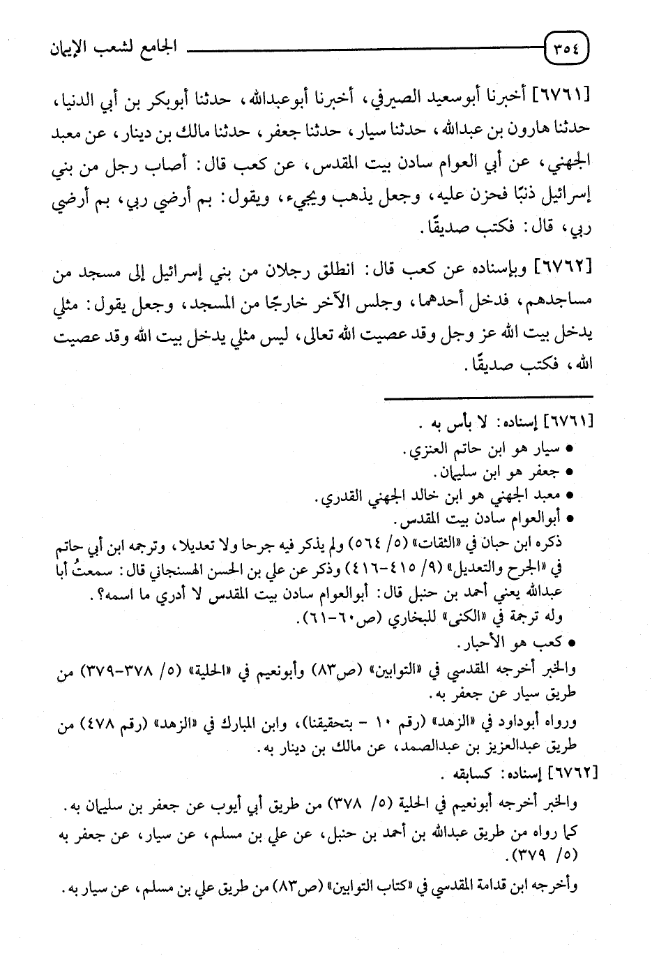 6762 - وَبِإِسْنَادِهِ، عَنْ كَعْبٍ، قَالَ: " §انْطَلَقَ رَجُلَانِ مِنْ بَنِي إِسْرَائِيلَ إِلَى مَسْجِدٍ مِنْ مَسَاجِدِهِمْ، فَدَخَلَ أَحَدُهُمَا وَجَلَسَ الْآخَرُ خَارِجًا مِنَ الْمَسْجِدِ وَجَعَلَ يَقُولُ: لَيْسَ مِثْلِي يَدْخُلُ بَيْتَ اللهِ عَزَّ وَجَلَّ وَقَدْ عَصَيْتُ اللهَ تَعَالَى، لَيْسَ مِثْلِي لِيَدْخُلَ بَيْتَ اللهِ وَقَدْ عَصَيْتُ اللهَ قَالَ: وَكُتِبَ صِدِّيقًا "