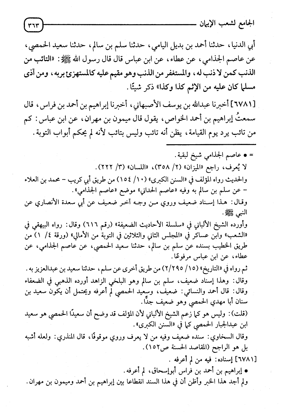 6781 - أَخْبَرَنَا عَبْدُ اللهِ بْنُ يُوسُفَ الْأَصْبَهَانِيُّ، أَنَا إِبْرَاهِيمُ بْنُ أَحْمَدَ بْنِ فِرَاسٍ، سَمِعْتُ إِبْرَاهِيمَ بْنَ أَحْمَدَ الْخَوَّاصَ يَقُولُ: قَالَ مَيْمُونُ بْنُ مِهْرَانَ، عَنِ ابْنِ عَبَّاسٍ: §" كَمْ مِنْ تَائِبٍ يَرِدُ يَوْمَ الْقِيَامَةِ يَظُنُّ أَنَّهُ تَائِبٌ وَلَيْسَ بِتَائِبٍ، لِأَنَّهُ لَمْ يُحْكِمْ أَبْوَابَ التَّوْبَةِ "