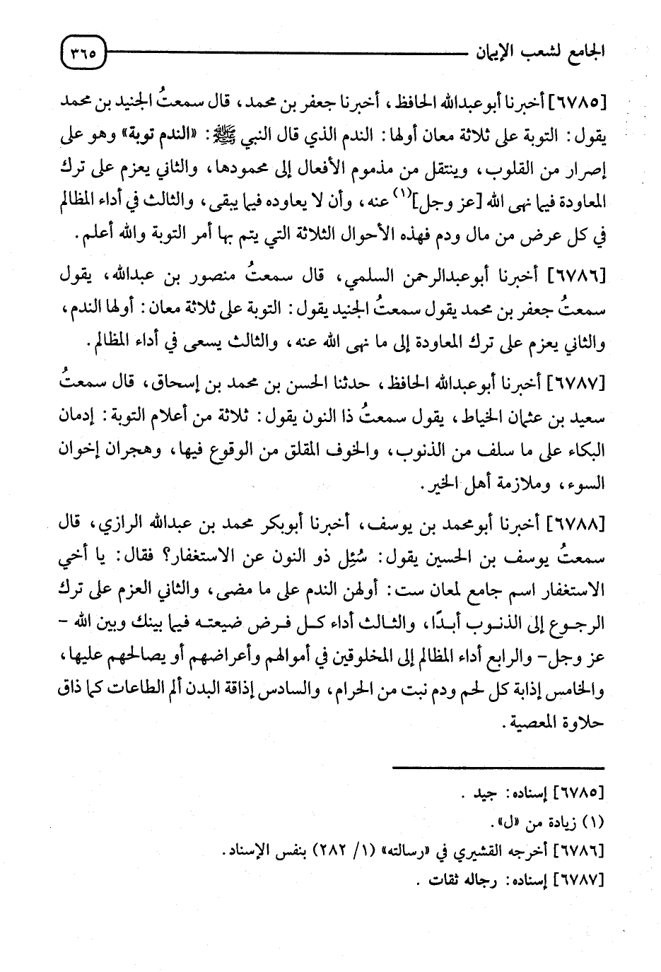 6785 - أَخْبَرَنَا أَبُو عَبْدِ اللهِ الْحَافِظُ، أَنَا جَعْفَرُ بْنُ مُحَمَّدٍ قَالَ: سَمِعْتُ الْجُنَيْدَ بْنَ مُحَمَّدٍ، يَقُولُ: التَّوْبَةُ عَلَى ثَلَاثَةِ مُعَانٍ: أَوَّلُهَا النَّدَمُ الَّذِي قَالَ النَّبِيُّ صَلَّى اللَّهُ عَلَيْهِ وَسَلَّمَ: " §النَّدَمُ تَوْبَةٌ ". وَهُوَ عَلَى إِصْرَارٍ مِنَ الْقُلُوبِ، وَتَنَقُّلٌ مِنْ مَذْمُومِ الْأَفْعَالِ إِلَى مَحْمُودِهَا. وَالثَّانِي يُعْزَمُ عَلَى تَرْكِ الْمُعَاوَدَةِ فِيمَا نُهِيَ، وَأَنْ لَا يُعَاوِدَهُ فِيمَا يَبْقَى، وَالثَّالِثُ فِي أَدَاءِ الْمَظَالِمِ فِي كُلِّ عَرَضٍ مِنْ مَالٍ وَدَمٍ، فَهَذِهِ الْأَحْوَالُ الثَّلَاثَةُ الَّتِي يَتِمُّ بِهَا أَمْرُ التَّوْبَةِ، وَاللهُ أَعْلَمُ
