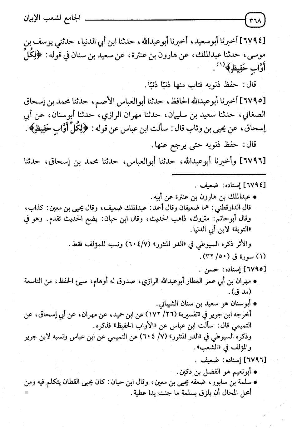 6794 - أَخْبَرَنَا أَبُو سَعِيدٍ، أَنَا أَبُو عَبْدِ اللهِ، نا ابْنُ أَبِي الدُّنْيَا، حَدَّثَنِي يُوسُفُ بْنُ مُوسَى، نا عَبْدُ الْمَلِكِ، عَنْ هَارُونَ بْنِ عَنْتَرَةَ، عَنْ سَعِيدِ بْنِ سِنَانٍ، فِي قَوْلِهِ: {§لِكُلِّ أَوَّابٍ حَفِيظٍ} [ق: 32]، قَالَ: " حَفِظَ ذُنُوبَهُ فَتَابَ مِنْهَا ذَنْبًا ذَنْبًا "