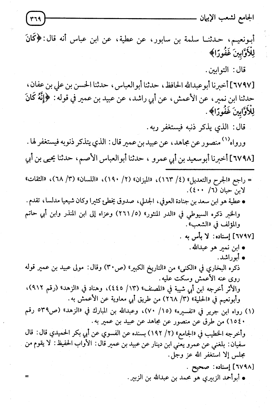 6797 - أَخْبَرَنَا أَبُو عَبْدِ اللهِ، نا أَبُو الْعَبَّاسِ، نا الْحُسَيْنُ بْنُ عَفَّانَ، نا ابْنُ نُمَيْرٍ، عَنِ الْأَعْمَشِ، عَنْ أَبِي رَاشِدٍ، عَنْ عُبَيْدِ بْنِ عُمَيْرٍ: فِي قَوْلِهِ: {§إِنَّهُ كَانَ لِلْأَوَّابِينَ غَفُورًا}، قَالَ: " الَّذِي يَذْكُرُ ذَنْبَهُ فَيَسْتَغْفِرُ رَبَّهُ ". وَرَوَاهُ مَنْصُورٌ، عَنْ مُجَاهِدٍ، عَنْ عُبَيْدِ بْنِ عُمَيْرٍ، قَالَ: " الَّذِي يَتَذَكَّرُ ذُنُوبَهُ فَيَسْتَغْفِرُ لَهَا "