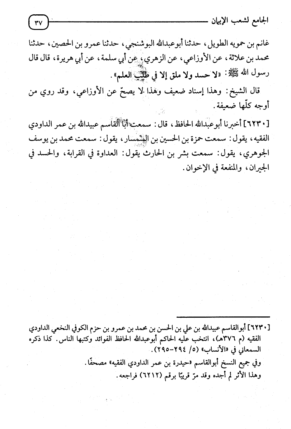 6230 - أَخْبَرَنَا أَبُو عَبْدِ اللهِ الْحَافِظُ قَالَ: سَمِعْتُ أَبَا الْقَاسِمِ حَيْدَرَةَ بْنَ عُمَرَ الدَّاوُدِيَّ الْفَقِيهَ يَقُولُ: سَمِعْتُ حَمْزَةَ بْنَ الْحُسَيْنِ السِّمْسَارَ يَقُولُ: سَمِعْتُ مُحَمَّدَ بْنَ يُوسُفَ الْجَوْهَرِيَّ، يَقُولُ: سَمِعْتُ بِشْرَ بْنَ الْحَارِثِ يَقُولُ: §" الْعَدَاوَةُ فِي الْقَرَابَةِ وَالْحَسَدُ فِي الْجِيرَانِ وَالْمَنْفَعَةُ فِي الْإِخْوَانِ "