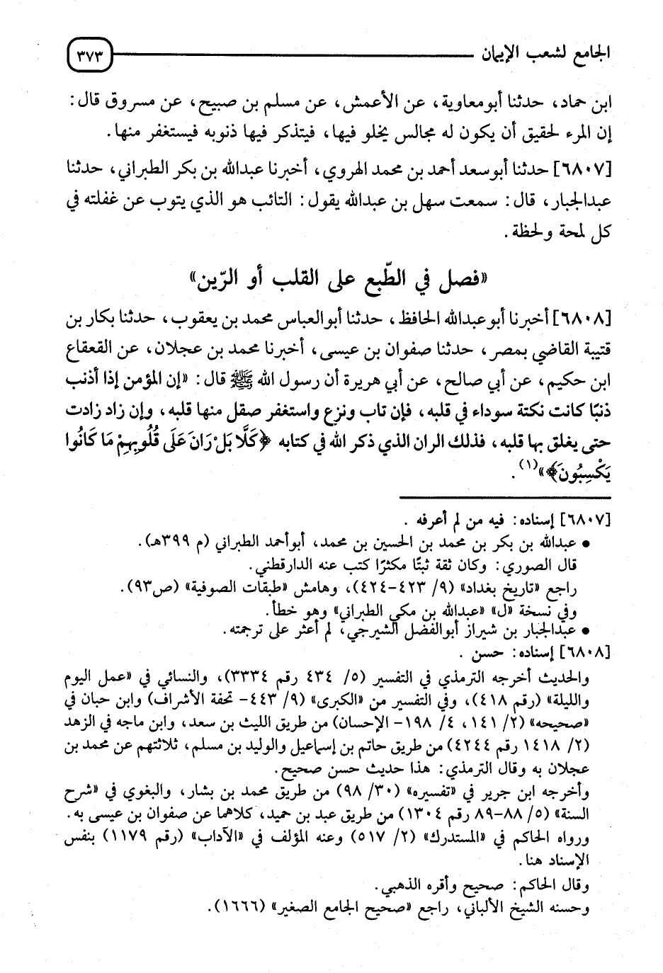 6808 - حَدَّثَنَا أَبُو عَبْدِ اللهِ الْحَافِظُ، نا أَبُو الْعَبَّاسِ مُحَمَّدُ بْنُ يَعْقُوبَ، نا بَكَّارُ بْنُ قُتَيْبَةَ الْقَاضِي بِمِصْرَ، نا صَفْوَانُ بْنُ عِيسَى، نا مُحَمَّدُ بْنُ عَجْلَانَ، عَنِ الْقَعْقَاعِ بْنِ حَكِيمٍ، عَنْ أَبِي صَالِحٍ، عَنْ أَبِي هُرَيْرَةَ، أَنَّ رَسُولَ اللهِ صَلَّى اللَّهُ عَلَيْهِ وَسَلَّمَ قَالَ: " إِنَّ §الْمُؤْمِنَ إِذَا أَذْنَبَ ذَنْبًا كَانَتْ نُكْتَةٌ سَوْدَاءُ فِي قَلْبِهِ، فَإِنْ تَابَ وَنَزَعَ وَاسْتَغْفَرَ صَقُلَ مِنْهَا قَلْبُهُ، وَإِنَّ زَادَ زَادَتْ حَتَّى يُغَلَّفَ بِهَا قَلْبُهُ، فَذَلِكَ الرَّانُ الَّذِي ذَكَرَ اللهُ فِي كِتَابِهِ {كَلَّا بَلْ رَانَ عَلَى قُلُوبِهِمْ مَا كَانُوا يَكْسِبُونَ} [المطففين: 14] "