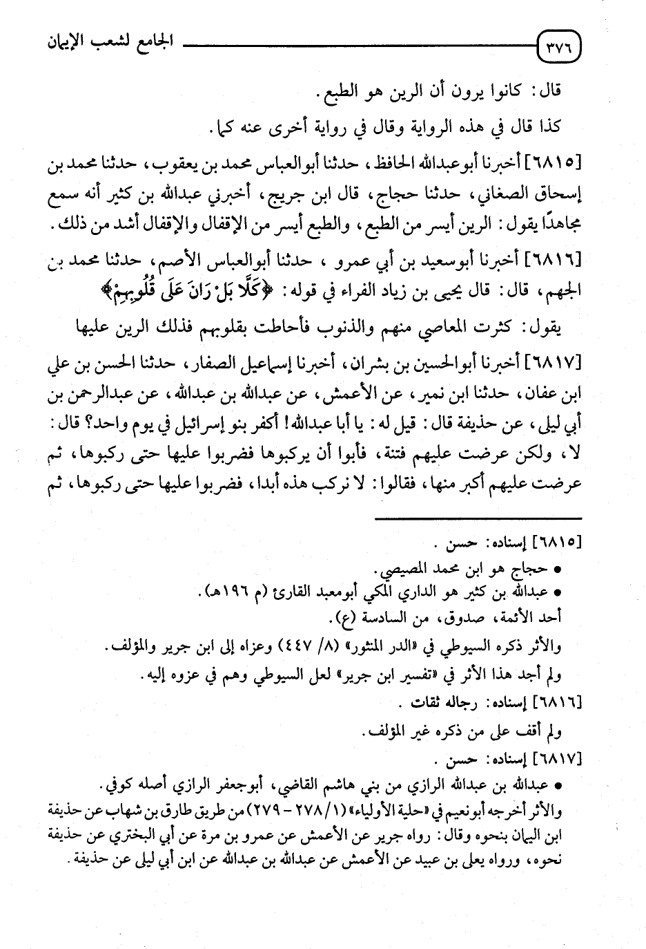6815 - أَخْبَرَنَا أَبُو عَبْدِ اللهِ الْحَافِظُ، نا أَبُو الْعَبَّاسِ مُحَمَّدُ بْنُ يَعْقُوبَ، نا مُحَمَّدُ بْنُ إِسْحَاقَ الصَّغَانِيُّ، نا حَجَّاجٌ، نا ابْنُ جُرَيْجٍ، أَخْبَرَنِي عَبْدُ اللهِ بْنُ كَثِيرٍ، أَنَّهُ سَمِعَ مُجَاهِدًا يَقُولُ: " §الرَّيْنُ أَيْسَرُ مِنَ الطَّبْعِ، وَالطَّبْعُ أَيْسَرُ مِنَ الْإِقْفَالِ، وَالْإِقْفَالُ أَشَدُّ مِنْ ذَلِكَ "
