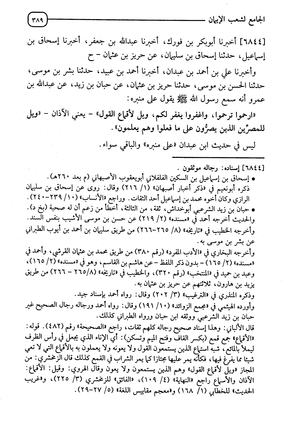 6844 - أَخْبَرَنَا أَبُو بَكْرِ بْنُ فَوْرَكٍ، أَنَا عَبْدُ اللهِ بْنُ جَعْفَرٍ، أَنَا إِسْحَاقُ، عَنْ إِسْمَاعِيلَ، نا إِسْحَاقُ بْنُ سُلَيْمَانَ، نا جَرِيرُ بْنُ عُثْمَانَ، ح، وَأَخْبَرَنَا عَلِيُّ بْنُ أَحْمَدَ بْنِ عَبْدَانَ، أَنَا أَحْمَدُ بْنُ عُبَيْدٍ، نا بِشْرُ بْنُ مُوسَى، نا الْحَسَنُ بْنُ مُوسَى، نا حَرِيزُ بْنُ عُثْمَانَ، عَنْ حِبَّانَ بْنِ يَزِيدَ، عَنْ عَبْدِ اللهِ بْنِ عَمْرٍو، أَنَّهُ سَمِعَ رَسُولَ اللهِ صَلَّى اللَّهُ عَلَيْهِ وَسَلَّمَ يَقُولُ عَلَى مِنْبَرِهِ: " §ارْحَمُوا تُرْحَمُوا، وَاغْفِرُوا يُغْفَرُ لَكُمْ، وَيْلٌ لِأَقْمَاعِ الْقَوْلِ - يَعْنِي الْآذَانَ - وَيْلٌ لِلْمُصِرِّينَ الَّذِينَ يُصِرُّونَ عَلَى مَا فَعَلُوا وَهُمْ يَعْلَمُونَ ". لَيْسَ فِي حَدِيثِ ابْنِ عَبْدَانَ: عَلَى مِنْبَرِهِ، وَالْبَاقِي سَوَاءٌ