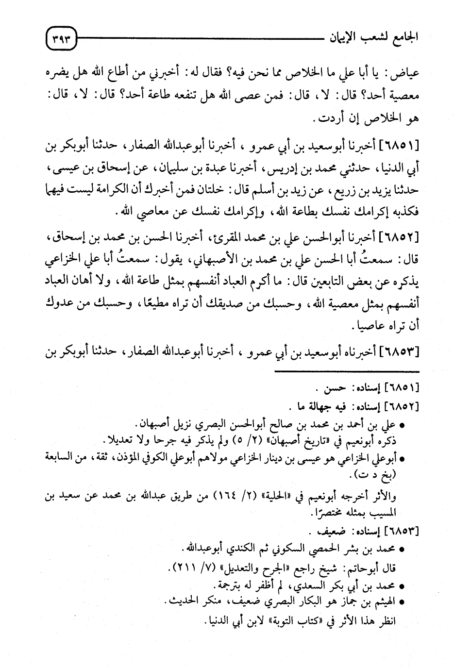 6851 - أَخْبَرَنَا أَبُو سَعِيدِ بْنُ أَبِي عَمْرٍو، أَنَا أَبُو عَبْدِ اللهِ الصَّفَّارُ، نا أَبُو بَكْرِ بْنُ أَبِي الدُّنْيَا، حَدَّثَنِي مُحَمَّدُ بْنُ إِدْرِيسَ، أَنَا عَبْدَةُ بْنُ سُلَيْمَانَ، عَنْ إِسْحَاقَ بْنِ عِيسَى، نا يَزِيدُ بْنُ زُرَيْعٍ، عَنْ زَيْدِ بْنِ أَسْلَمَ قَالَ: " §خِلَّتَانِ فَمَنْ أَخْبَرَكَ أَنَّ الْكَرَامَةَ إِلَّا فِيهِمَا فَكَذِّبْهُ: إِكْرَامُكَ نَفْسَكَ بِطَاعَةِ اللهِ، وَإِكْرَامُكَ نَفْسَكَ عَنْ مَعَاصِي اللهِ "