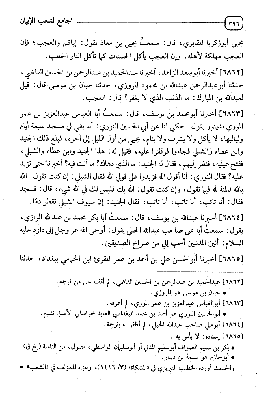 6862 - أَخْبَرَنَا أَبُو سَعْدٍ الزَّاهِدُ، أَنَا عَبْدُ الْحَمِيدِ بْنُ عَبْدِ الرَّحْمَنِ بْنِ الْحُسَيْنِ الْقَاضِي، نا أَبُو عَبْدِ الرَّحْمَنِ عَبْدُ اللهِ بْنُ مَحْمُودٍ الْمَرْوَزِيُّ، نا حَسَّانُ بْنُ مُوسَى قَالَ: قِيلَ لِعَبْدِ اللهِ بْنِ الْمُبَارَكِ: §مَا الذَّنْبُ الَّذِي لَا يُغْفَرُ؟، قَالَ: " الْعُجْبُ "