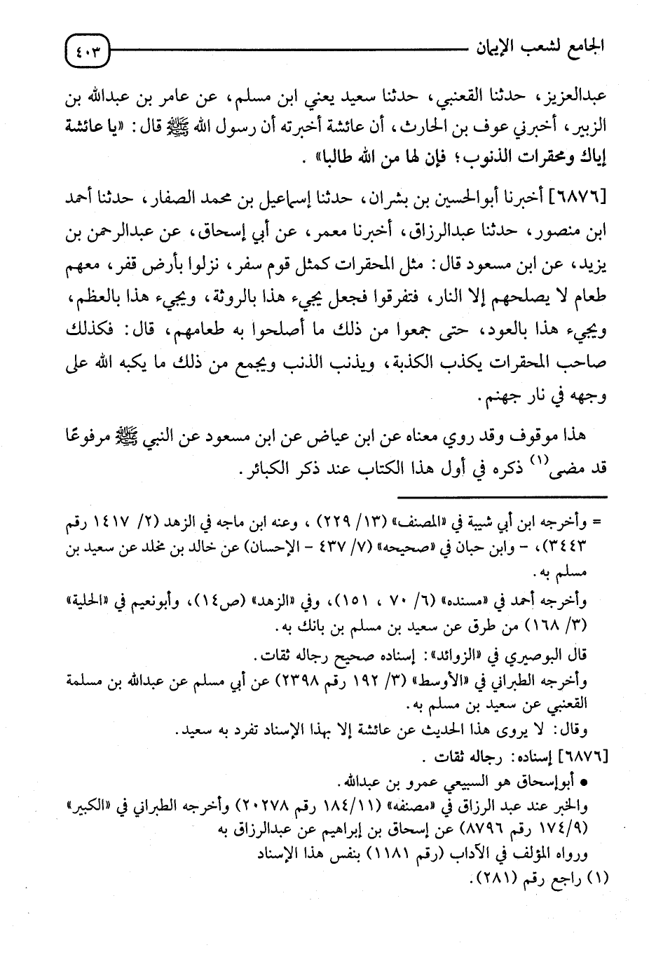 6876 - أَخْبَرَنَا أَبُو الْحَسَنِ بْنُ بِشْرَانَ، أَنَا إِسْمَاعِيلُ بْنُ مُحَمَّدٍ الصَّفَّارُ، نا أَحْمَدُ بْنُ مَنْصُورٍ، نا عَبْدُ الرَّزَّاقِ، أَنَا مَعْمَرٌ، عَنْ أَبِي إِسْحَاقَ، عَنْ عَبْدِ الرَّحْمَنِ بْنِ يَزِيدَ، عَنِ ابْنِ مَسْعُودٍ، قَالَ: §" مَثَلُ الْمُحَقَّرَاتِ كَمَثَلِ قَوْمِ سَفْرٍ تُرِكُوا بِأَرْضٍ قَفْرٍ، مَعَهُمْ طَعَامُهُمْ لَا يُصْلِحُهُمْ إِلَّا النَّارُ، فَتَفَرَّقُوا فَيَجِيءُ هَذَا بِالرَّوْثَةِ، وَيَجِيءُ هَذَا بِالْعَظْمِ، وَيَجِيءُ هَذَا بِالْعُودِ، حَتَّى جَمَعُوا مِنْ ذَلِكَ مَا أَصْلَحُوا بِهِ طَعَامَهُمْ قَالَ: فَكَذَلِكَ صَاحِبُ الْمُحَقَّرَاتِ، يَكْذِبُ الْكَذْبَةَ، وَيُذْنِبُ الذَّنْبَ، وَيَجْمَعُ مِنْ ذَلِكَ مَا يَكُبُّهُ اللهُ عَلَى وَجْهِهِ فِي نَارِ جَهَنَّمَ " " هَذَا مَوْقُوفٌ وَقَدْ رَوِيَ مَعْنَاهُ عَنْ أَبِي عِيَاضٍ، عَنِ ابْنِ مَسْعُودٍ، عَنِ النَّبِيِّ صَلَّى اللَّهُ عَلَيْهِ وَسَلَّمَ مَرْفُوعًا، وَقَدْ مَضَى ذِكْرُهُ فِي أَوَّلِ هَذَا الْكِتَابِ، عِنْدَ ذِكْرِ الْكَبَائِرِ "